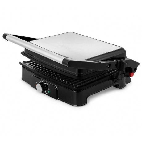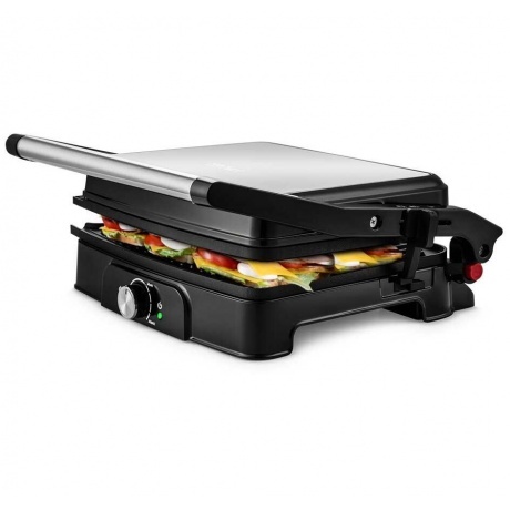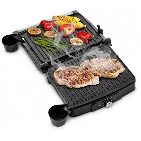 Электрогриль КТ-1655 предназначен для приготовления мяса, рыбы, овощей, сосисок, бутербродов, сэндвичей, гренок, тостов! Высокая t способствует быстрому приготовлению продуктов, а ребристая поверхность – появлению на них характерного «полосатого» рисунка. В одностороннем режиме крышка гриля откидывается на 180°, благодаря чему гриль превращается в большую жаровню, а продукты можно выложить сразу на две панели. Для раскладывания гриля предусмотрена специальная кнопка на боковой части корпуса. Используйте этот режим, если готовка в двустороннем режиме невозможна из-за того, что верхняя крышка может раздавить пищу под собственным весом, либо если продукты имеют неравномерную толщину. Например, для горячих бутербродов или пиццы.