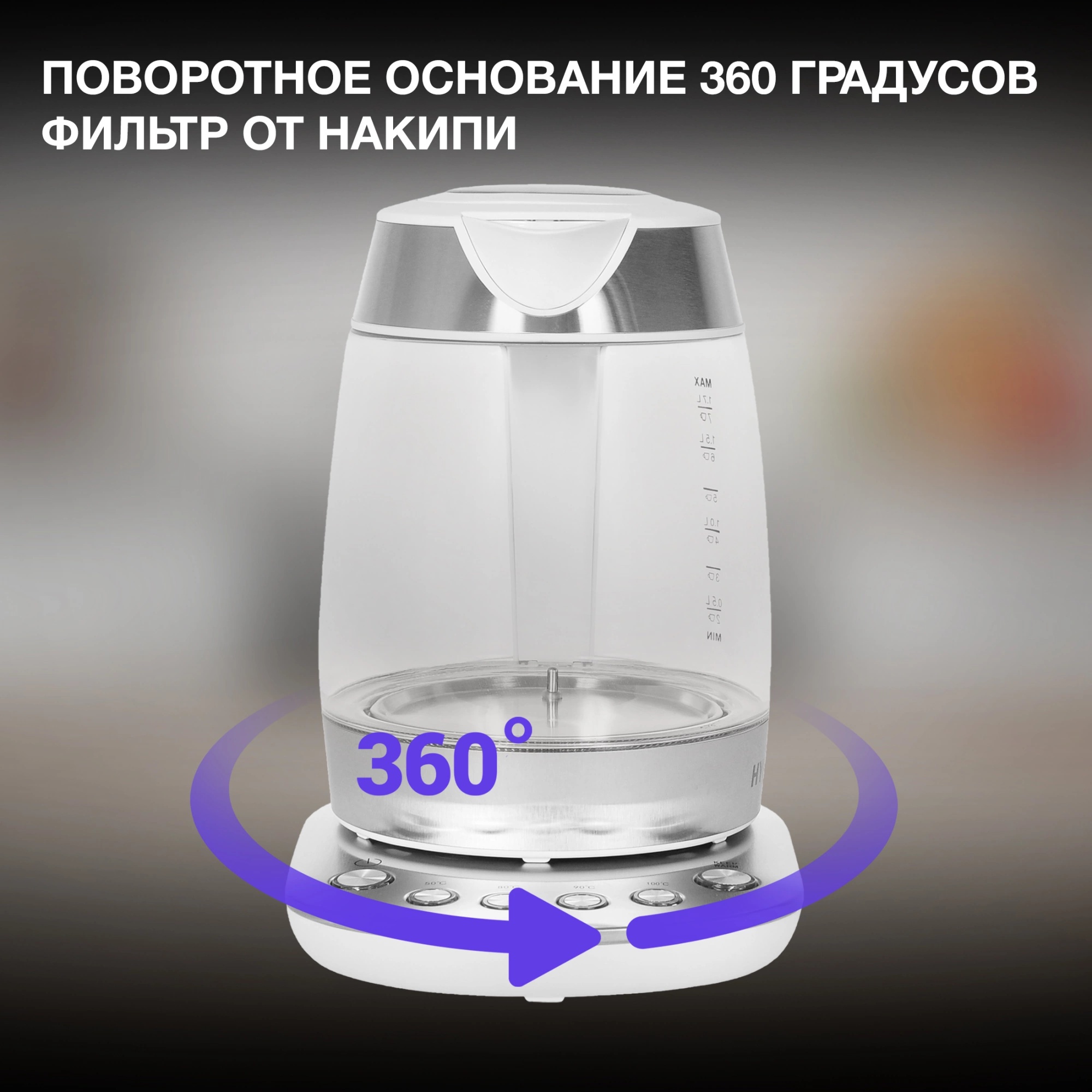 В носике HYK-G4033 установлен фильтр от накипи, он улавливает даже самые мелкие её частицы. Нагревательный элемент прибора скрыт в подставке, на которой он может проворачиваться на 360 градусов.