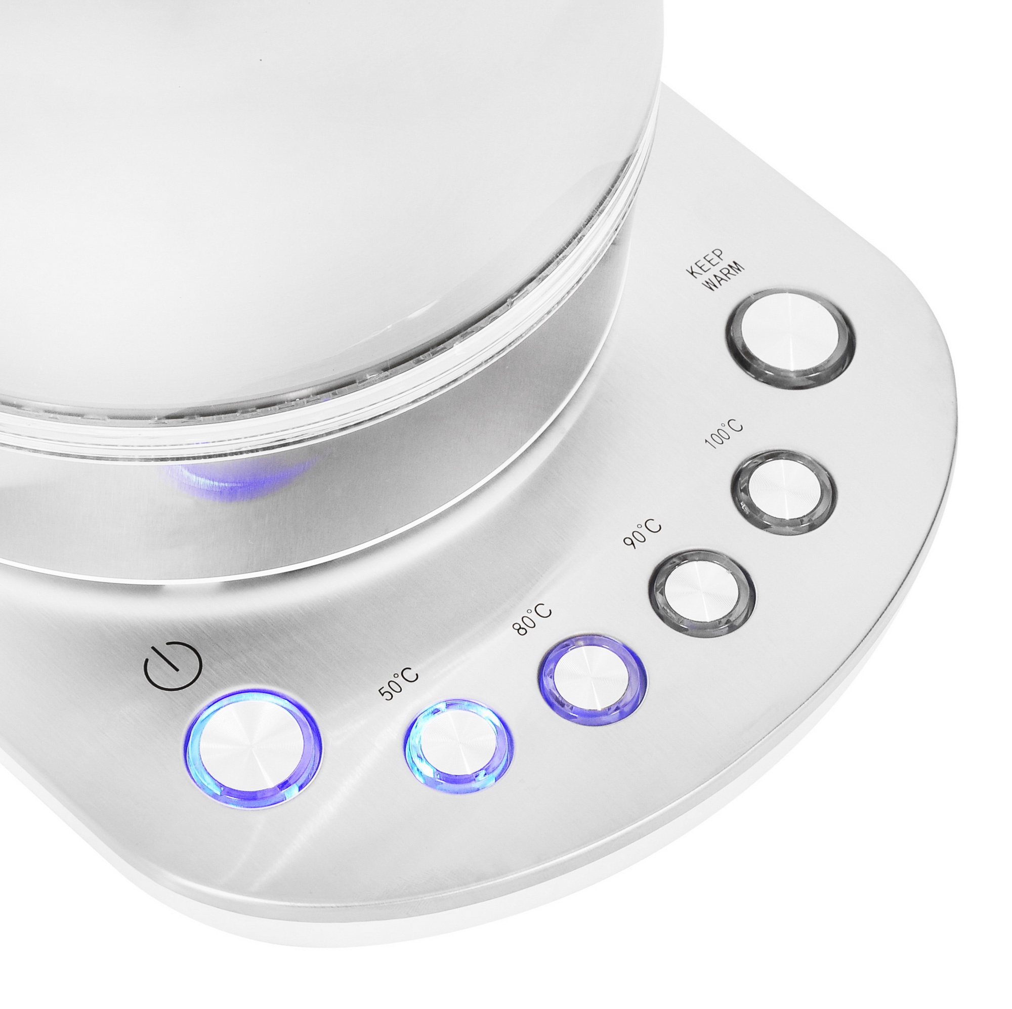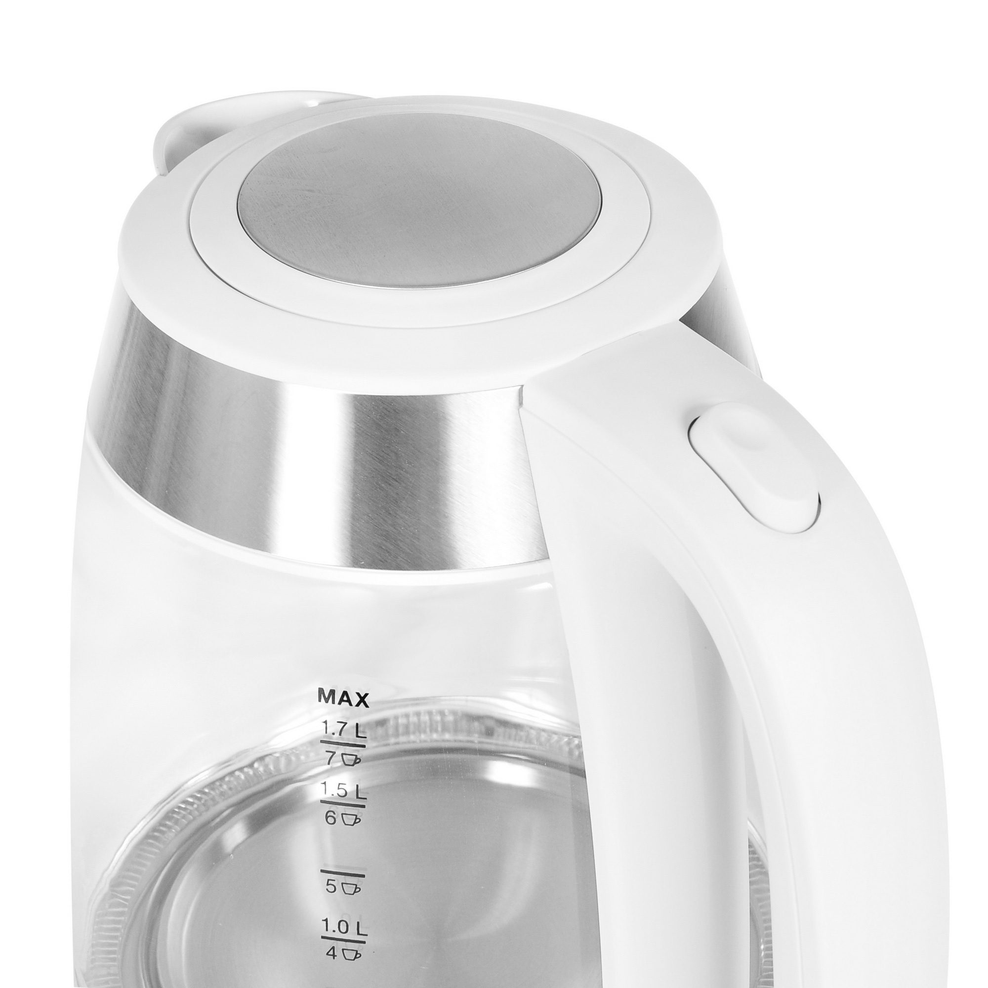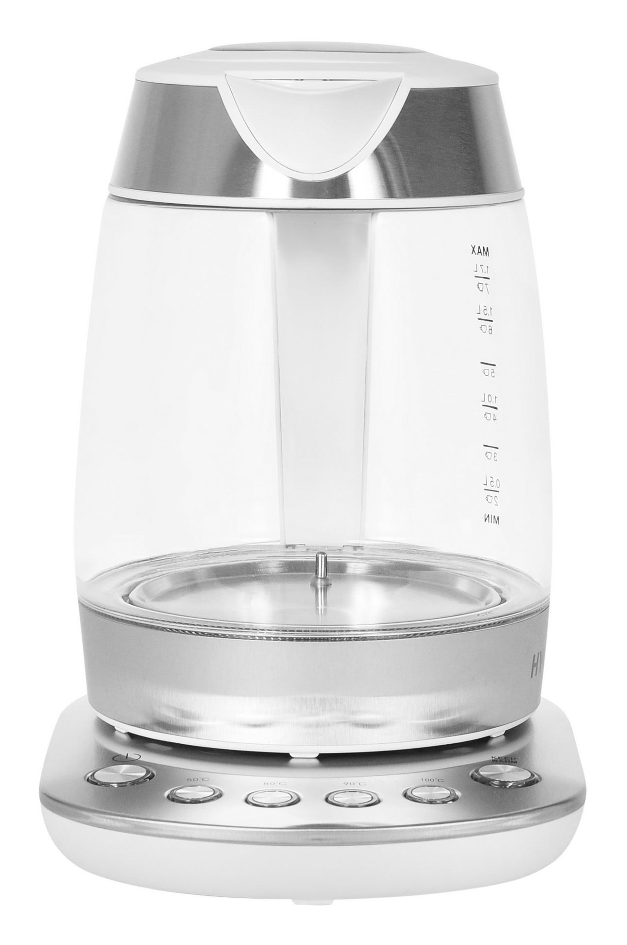 Корпус девайса выполнен из специального стекла. Оно помогает удерживать тепло внутри электрического чайника, а также прекрасно выглядит в сочетании с работающей подсветкой, встроенной в дно. Свет активируется в начале каждого цикла, а в конце устройство отключается автоматически. Ёмкость электрического чайника составляет 1,7 л, о его наполненности можно судить по рискам, нанесенным на стенку.