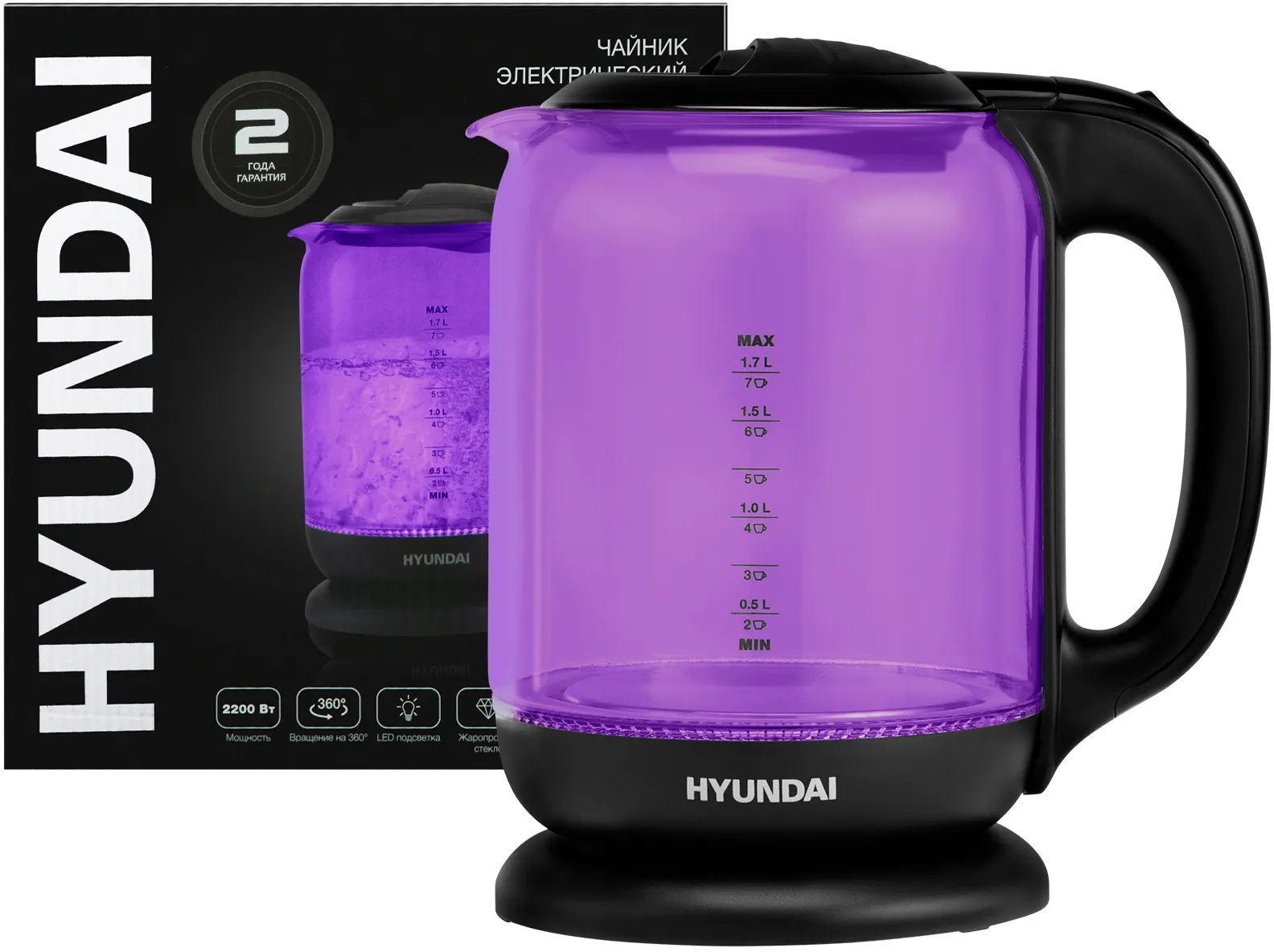 Электрочайник Hyundai HYK-G5809 обладает стильным дизайном и яркой подсветкой, благодаря чему подчеркнет стиль вашего интерьера. Объем чайника составляет 1, 8 литра - вы сможете вскипятить воду сразу на всю семью. За счет мощности устройства в 2200 Вт вам не придется ждать горячие напитки долгое время. Конструкция нагревательного элемента закрытая спираль даст возможность кипятить даже небольшие порции жидкости. Прибор дополнен защитой включения без воды.