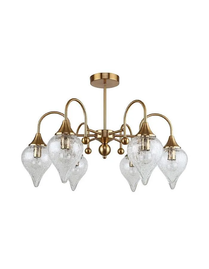 Актуальный цвет античной бронзы.Стеклянные плафоны оригинальной формы из кракелированного стекла создают красивую игру света.Компактный размер светильника прекрасно подойдет к стандартным потолкам.Изящные рожки с декором.Заменяемые источники света удобны в эксплуатации.