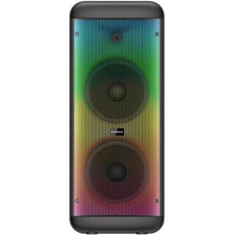 Аудиосистема Hyundai H-MC1235 обеспечивает высокую громкость и яркую многоцветную подсветку для любого мероприятия. Колонка оснащена двумя громкими и качественными стереодинамиками с суммарной мощностью до 80 Вт. Их долгое звучание обеспечивает аккумуляторная батарея ёмкостью 2400 мАч. Однако прибор также может работать и от сети. Все входы, нужные для подключения к девайсу, находятся на его верхней части: слот USB для флеш-накопителей памяти, порт для карт micro SD, разъём AUX и микрофонный вход для караоке-вечеринок и ведущих. Там же располагается яркий жидкокристаллический экран, показывающий инфо о текущем воспроизведении, регуляторы громкости и эха, а также кнопки, отвечающие за управление различными параметрами. Кроме того, устройство поддерживает синхронизацию со смартфоном при помощи Bluetooth (с TWS) и управление с пульта, идущего в комплекте поставки. Встроенный радио-тюнер – ещё одна удобная дополнительная функция данной модели. Корпус портативной колонки Hyundai H-MC1235 сделан из надежного, прочного и лёгкого сочетания металла и пластика, а динамики защищены отдельной решёткой. Рядом с верхней панелью управления прибора располагается эргономичная ручка, облегчающая переноску девайса. Аудиосистема оснащена красочной подсветкой, которая дополняет атмосферу вечеринки.