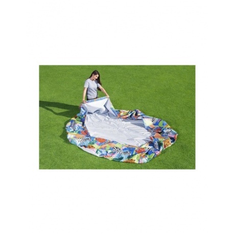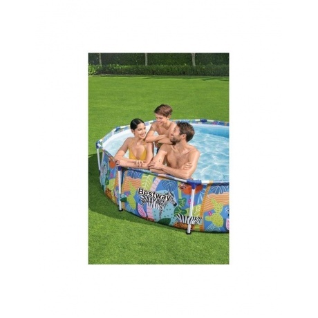 Каркасный бассейн Bestway 56985 отличается яркой расцветкой. Чаша выполнена из высококачественного трехслойного ПВХ: два слоя плотного винила и между ними сетка из полиэстера для особой прочности. Цвет чаши бассейна снаружи разноцветный с элементами джунглей и диких животных. Каркас металлический, покрытый предотвращающим появление коррозии слоем пластика. Не требует бетонирования и подготовки ямы, все, что нужно, это плоская, горизонтальная площадка. Сезонный бассейн (рекомендуется разбирать на холодное время года) обладает простой конструкцией - может быть легко разобран и собран заново. Время сборки и подключения бассейна составляет около 20 мин.