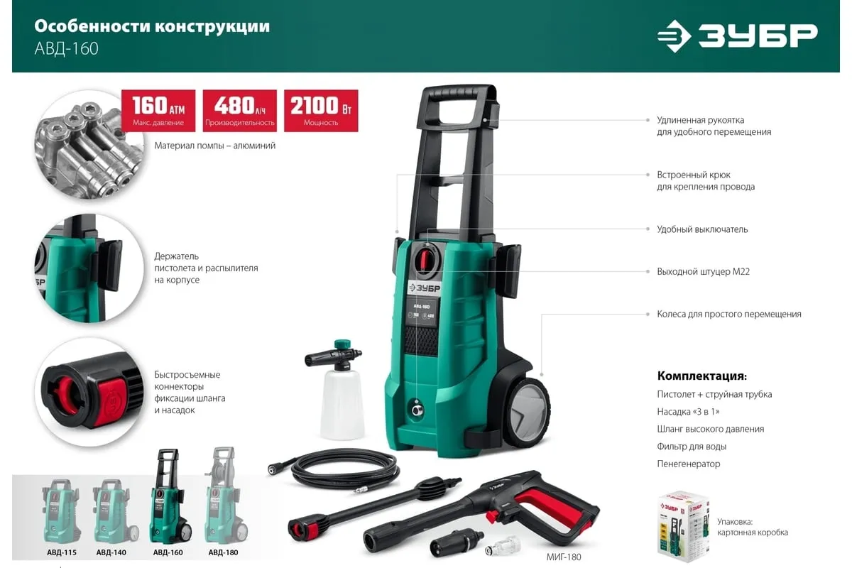 Описание товара Мойка высокого давления ЗУБР 160 Атм, 2100 Вт