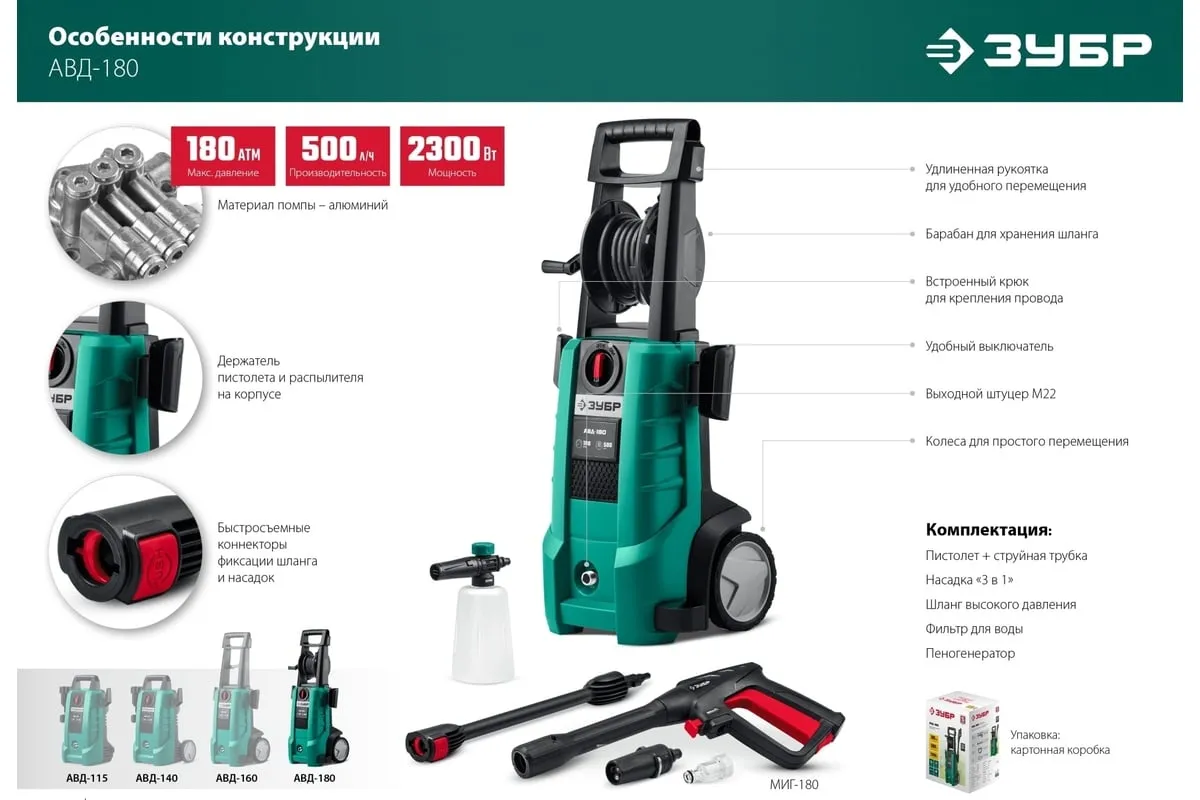 Мойка высокого давления ЗУБР АВД-180 используется для мойки автомобилей, велосипедов и другой колесной техники, садового инвентаря, наружных стен и уличных покрытий. Изделие предназначено для использования только вне помещений. Благодаря системе полной остановки, помпа не работает при не нажатом пистолете - это экономит воду и ресурс изделия при неизбежных паузах в работе. Элегантный дизайн и удобная конструкция с держателями для аксессуаров делают работу с изделием комфортной. Регулировка выходной струи позволяет обрабатывать различные поверхности - автомобили, стены, велосипеды, напольные покрытия и другое.