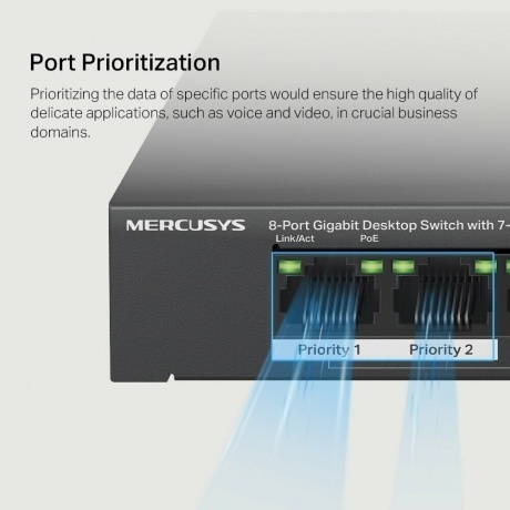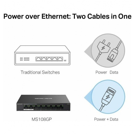 Всего коммутатора MS108GP восемь портов, семь из которых поддерживают технологию PoE. Бюджет каждого порта PoE+ составляет 30 Вт. Такие порты позволяют подавать питание на устройства стандартов 802.3af/at. Общий бюджет PoE составляет 65 Вт. Этого хватит для развертывания системы видеонаблюдения офисах общежитиях. Технология PoE позволяет подавать питание на точки доступа, IP-телефоны, компьютеры, видеорегистраторы ряд других устройств.