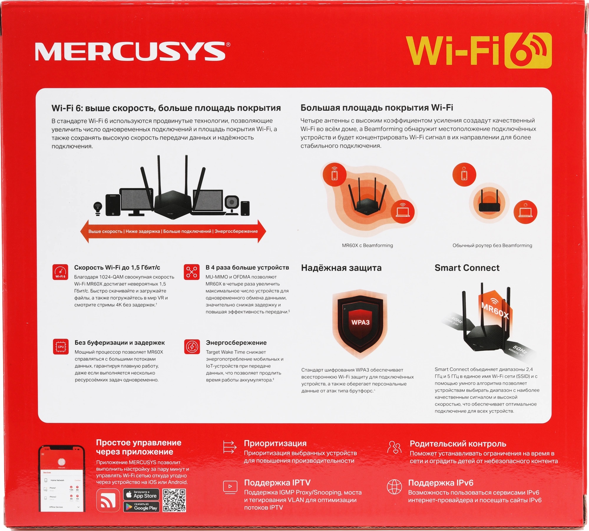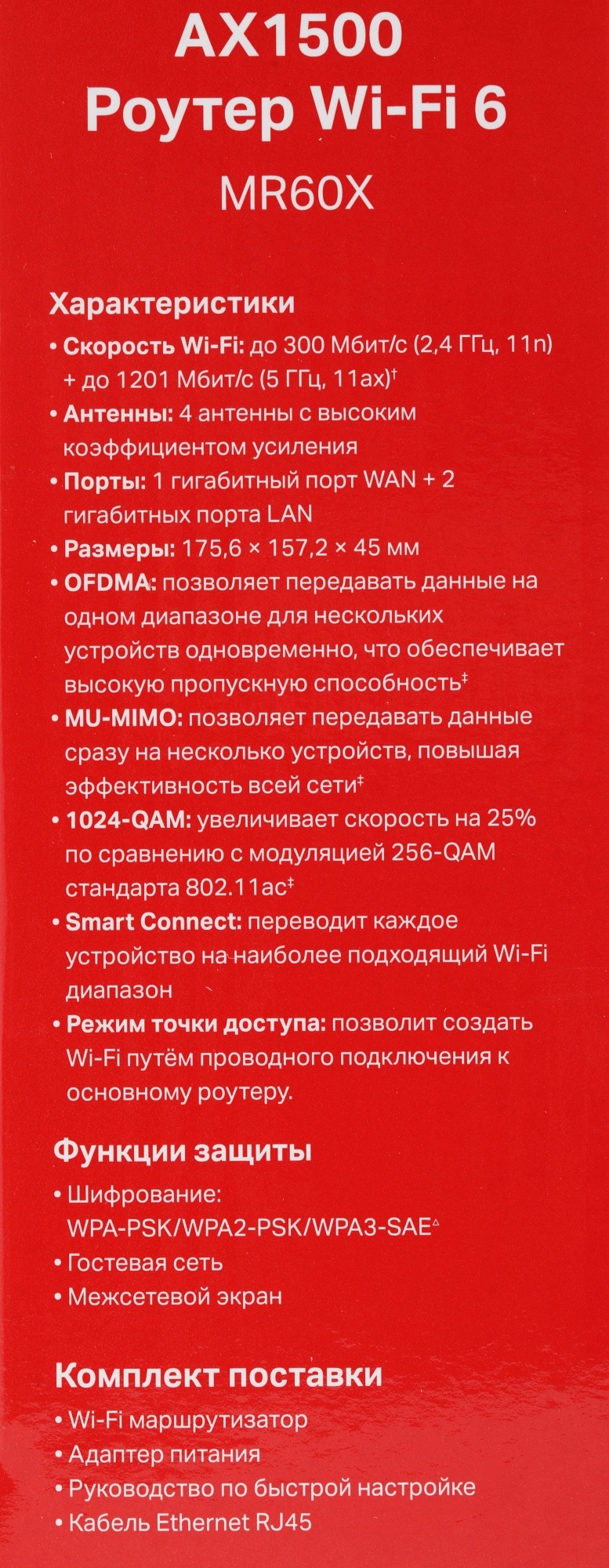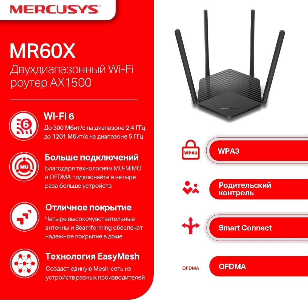 Mercusys MR60X - двухдиапазонный Wi?Fi роутер AX1500 с совокупной скорость до 1,5 Гбит/с — до 300 Мбит/с на диапазоне 2,4 ГГц, до 1201 Мбит/с на диапазоне 5 ГГц. Технологии OFDMA и MU?MIMO позволяют обмениваться данными сразу с несколькими устройствами, повышая эффективность работы сети. Wi?Fi 6 также снижает нагрузку на сеть за счёт увеличения количества подключений в четыре раза с помощью технологий MU?MIMO и OFDMA. Роутер обменивается данными сразу с несколькими устройствами, что улучшает эффективность передачи данных и пропускную способность всей сети. Четыре внешние антенны с высоким коэффициентом усиления вкупе с передовыми технологиями обеспечат отличный сигнал во всём доме, а технология Beamforming обнаружит подключённые устройства и будет концентрировать Wi?Fi сигнал в их направлении, увеличивая стабильность подключения — наслаждайтесь быстрым и стабильным подключением Wi?Fi, где бы вы ни были.