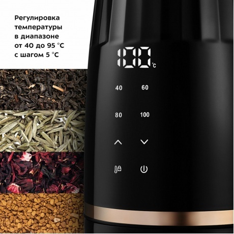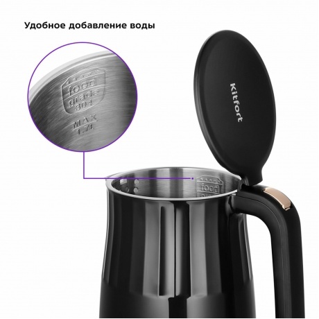 Электрический чайник КТ-6610 - отличное решение для ежедневного использования или особых моментов с родными и друзьями. Благодаря оригинальному дизайну он станет украшением вашей кухни. Вы можете выбрать 4 режима нагрева или самостоятельно настроить t °С от 40 до 95 °С с шагом 5 °С. Это крайне удобно для правильного заваривания разных сортов чая. Управление сенсорное, LED-дисплей показывает текущую t °С или заданную t °С нагрева. Чайник оснащён функцией поддержания t °С в течение 2 ч на заданном уровне. Температура задаётся либо кнопками выбора: 40, 60, 80 или 100°С, либо с помощью кнопок “Больше” или “Меньше” на панели управления. Горлышко большого диаметра и широко открывающаяся крышка позволяют легко наполнять водой, а также чистить чайник. Отметка максимального уровня воды располагается на внутренней поверхности прибора. Изнутри крышка и корпус выполнены из нержавеющей стали. Чайник имеет широкий носик, который даёт хорошую струю воды без брызг. Ручка пластиковая, не нагревается и удобно лежит в руке. Подставка с центральным контактом даёт возможность располагать на ней чайник в любом положении, обеспечивая вращение на 360°. При закипании чайник автоматически отключается. Прибор имеет защиту от перегрева и от включения без воды. На дне подставки имеется отсек для хранения шнура, чтобы его излишки не мешались на столе.