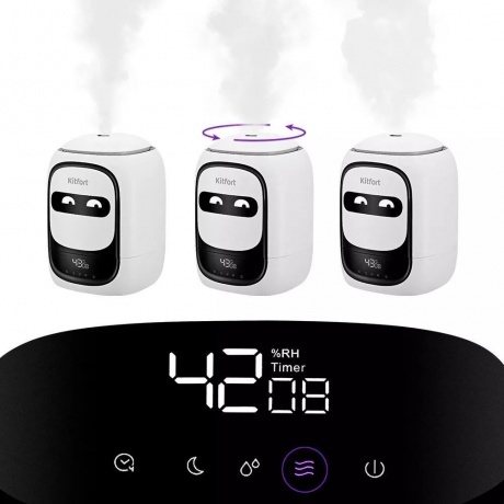 Ультразвуковой увлажнитель КТ-2878, отличающийся высокой надёжностью работы и оригинальным дизайном, увлажняет воздух в помещении, создавая хороший микроклимат для проживания людей. Может использоваться в помещениях площадью до 30 м?. Увлажнитель генерирует не горячий пар, а холодный туман. Частицы тумана мелкие, они обладают большой суммарной поверхностью, а потому быстро испаряются, что приводит к повышению влажности воздуха. Сопло для выхода тумана можно поворачивать на 360°. Вы можете задавать желаемый уровень влажности от 40 до 90% с шагом 5%, а также время работы увлажнителя - от 1 до 12 ч с шагом 1 ч. На дисплее отображаются текущая влажность и таймер. Вы можете выключить дисплей, воспользовавшись кнопкой “Ночной режим”. Наполнить резервуар ёмкостью 4.8 л можно, сняв его с основания, или залить воду в резервуар, установленный на основание увлажнителя. Рекомендуем использовать дистиллированную воду или воду с низким содержанием солей и минералов. В данной модели предусмотрена ванночка для ароматизации воздуха с губкой, на которую добавляют эфирные или аромамасла. Достаточно пары капель, чтобы, помимо увлажнения воздуха, получить приятный аромат цитрусовых, чайного дерева, мяты, хвойного леса и др. Установленный внутри пьезокерамический излучатель, погружённый в воду, с помощью ультразвуковых колебаний выбивает с поверхности воды мельчайшие капли, которые образуют туман. Он выдувается встроенным вентилятором и разносится по помещению. Простая конструкция увлажнителя КТ-2878 позволяет легко разбирать и чистить прибор.