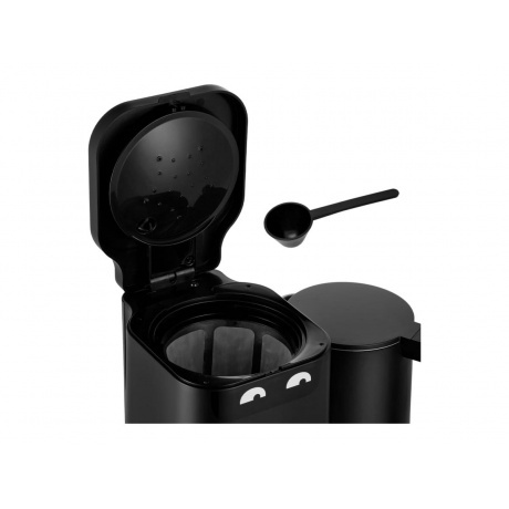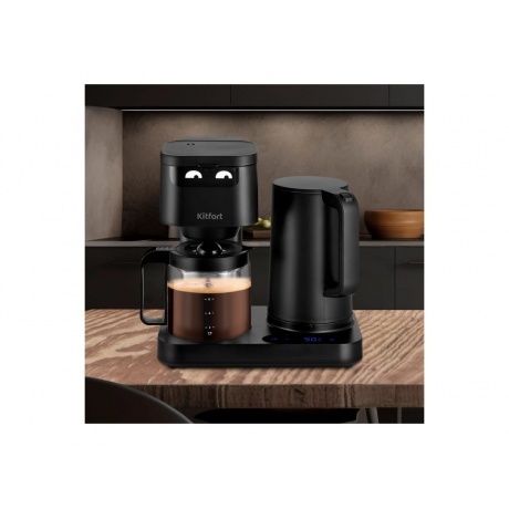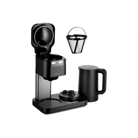 При приготовлении кофе вода нагревается в чайнике, а затем подкачивается помпой в кофеварку и подается в фильтр с молотым кофе. Многоразовый фильтр позволяет заваривать кофе неограниченное количество раз. Температуру воды для приготовления кофе можно настроить 60–100 °C с шагом 5 °C. Пройдя через фильтр, кофе поступает в стеклянный кофейник. В месте установки кофейника находится платформа для подогрева. По завершении приготовления кофе включается подогрев на 30 минут. Воронка кофеварки оборудована противокапельной системой Вы можете налить кофе в чашку, не дожидаясь окончания приготовления. Кофеварка «2 в 1» рассчитана на приготовление 2, 4, 6 или 8 чашек кофе. Многоразовый фильтр вмещает до 48 грамм молотого кофе. Вы также можете просто вскипятить воду в чайнике, не включая приготовление кофе. Также это может уберечь от ожога. Нагревательный элемент (ТЭН) у этой модели чайника скрытый и находится в донной части. Сверху он закрыт специальной металлической пластиной из нержавеющей стали, благодаря которой исключается прямой контакт ТЭНа с водой. Такая конструкция препятствует образованию накипи, облегчает уход и значительно снижает шум при нагревании воды. Управление осуществляется при помощи двух кнопок на панели управления. На дисплее отображаются текущая температура воды в чайнике, количество воды подаваемой в фильтр и время таймера подогрева.