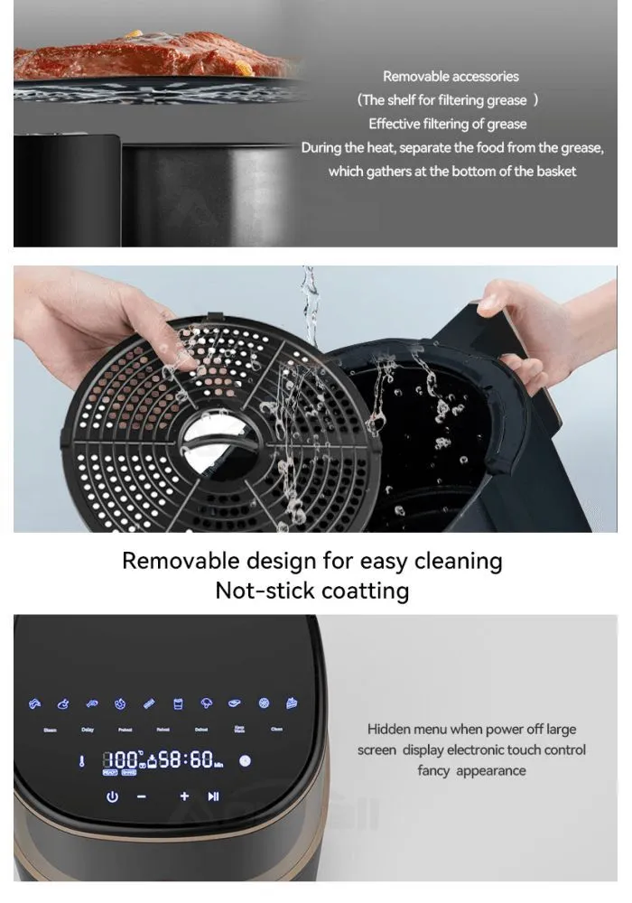 Одно устройство с несколькими функциями, позволяющими легко справляться с различными продуктами. Фритюрница с функцией приготовления на пару. Резервуар для воды: 350 мл с поддоном для воды в нижней части. Электронное сенсорное управление, цифровой скрытый экран, наглядное меню и дисплей. Диапазон температур: 40~200°C. С обзорным окошком для легкого приготовления пищи. Внутренняя кастрюля из углеродистой стали с антипригарным покрытием, одна чаша. Максимальное время приготовления 60 мин. Равномерная температура во внутренней чаше. Чаша и решетка для выпечки.