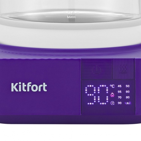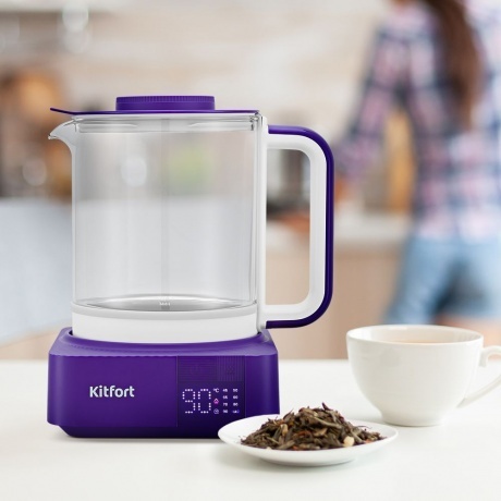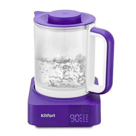 Электрический чайник с электронным терморегулятором Kitfort КТ-6191 может не только вскипятить воду, но и нагреть её до температур: 45, 50, 55, 60, 70, 80 и 90 °С, что очень удобно при заваривании различных сортов чая. Корпус чайника выполнен из стекла и нержавеющей стали, а крышка и подставка — из сочетания пластика и нержавеющей стали. Мерная шкала нанесена на стеклянную часть корпуса. Ручка чайника пластиковая, не нагревается и удобно лежит в руке. Подставка с центральным контактом даёт возможность располагать на ней чайник в любом положении, обеспечивая вращение на 360 °. На подставке чайника расположена панель управления. На дисплее отображается температура воды и значок режима. Во время работы чайника дисплей показывает текущую температуру воды и выбранную температуру нагрева, что очень удобно. Чайник имеет функцию поддержание температуры в течение 24 часов. Полный чайник закипает примерно за десять минут. Прибор имеет защиту от перегрева и от включения без воды: при включении без воды чайник нагревается и отключается (срабатывает защита от перегрева).