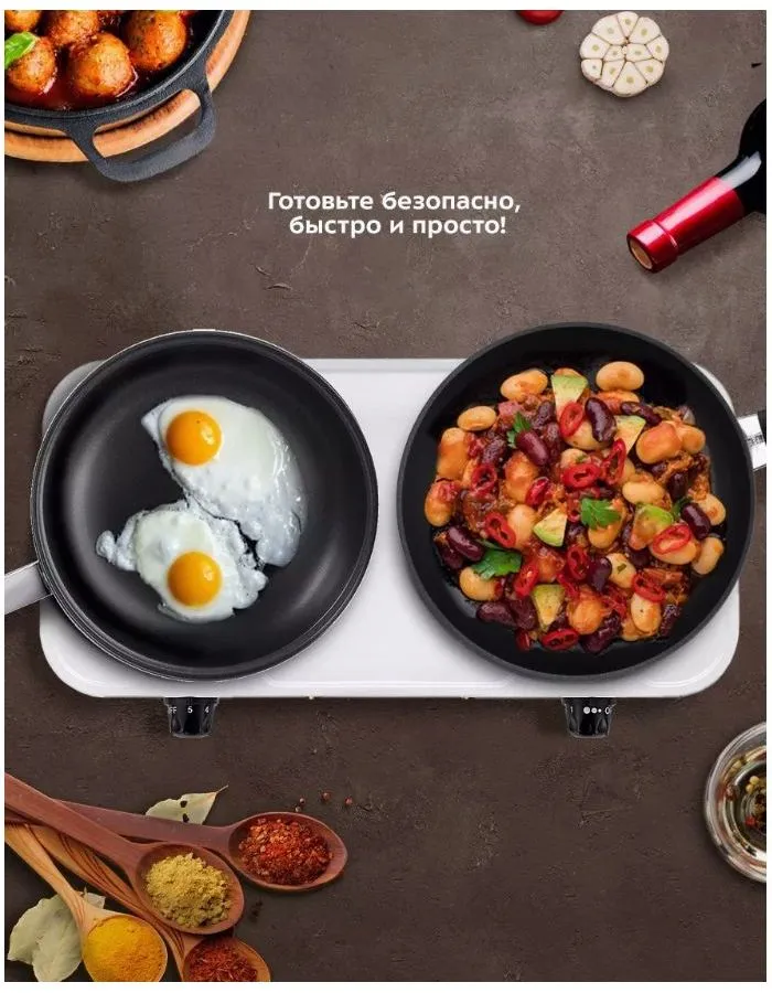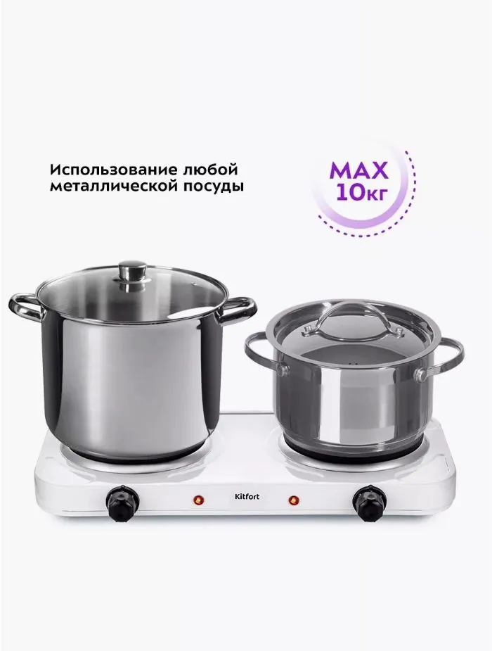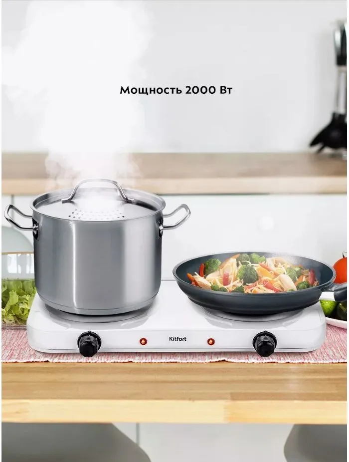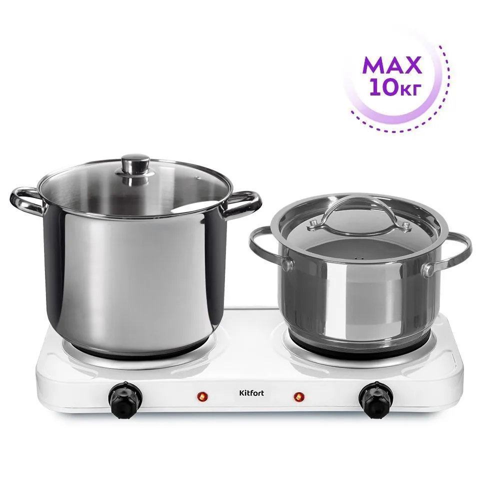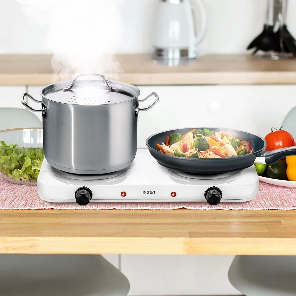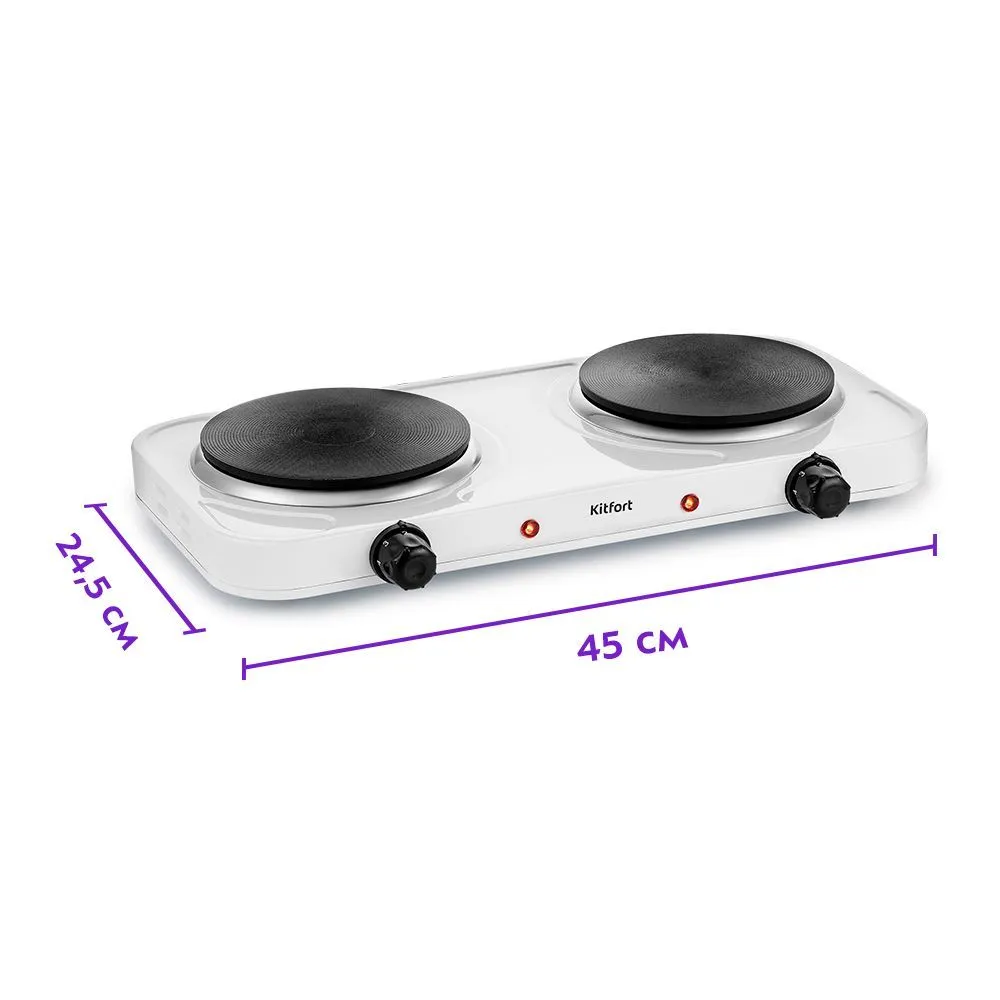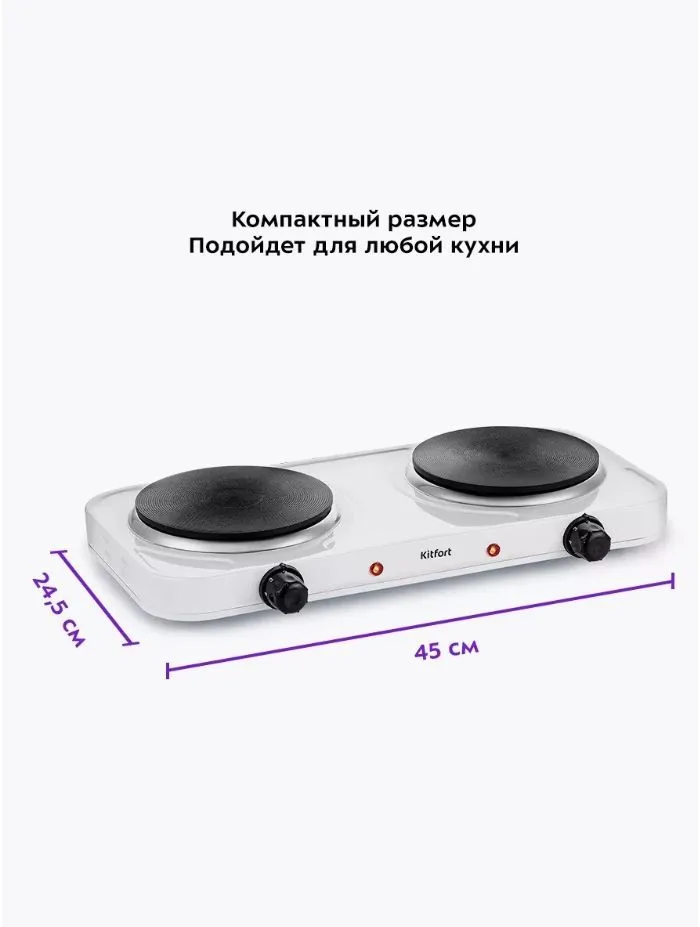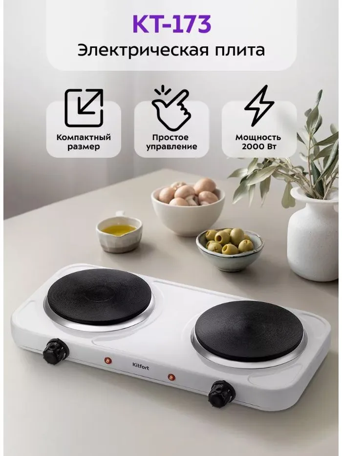 Электрическая плита Kitfort КТ-173 поможет приготовить блюда самой разнообразной кухни. Плита компактная и простая в управлении, поэтому с приготовлением на ней справится любой. Плавная регулировка температуры позволяет настроить нагрев под любые блюда. Регулировка температуры позволяет настроить нагрев для приготовления любых блюд. Легко и быстро настроив температуру, вы можете жарить, тушить или варить. Прямой нагрев позволяет использовать любую металлическую посуду, даже алюминиевые сковороды. На плите можно готовить в любом месте, где есть электричество, это делает плиту универсальной и простой в использовании. Мощность каждой конфорки – 1000 Вт, так что вы сможете приготовить даже самые сложные блюда!. Прямой нагрев позволяет использовать любую металлическую посуду. Плита выдерживает вес не более 10 кг. В плите установлены специальные термопредохранители для каждой конфорки, которые в случае перегрева плиты разорвут электрическую цепь и отключат нагрев. Электрическая лита выполнена в минималистичном дизайне благодаря чему впишется в любой интерьер. Компактные размеры плиты позволят использовать ее на любой кухне, даже самой маленькой. Корпус и конфорки плиты выполнены из металла, благодаря чему после приготовления еды вы можете с легкостью убрать плитку от остатков пищи и прочих загрязнений.
