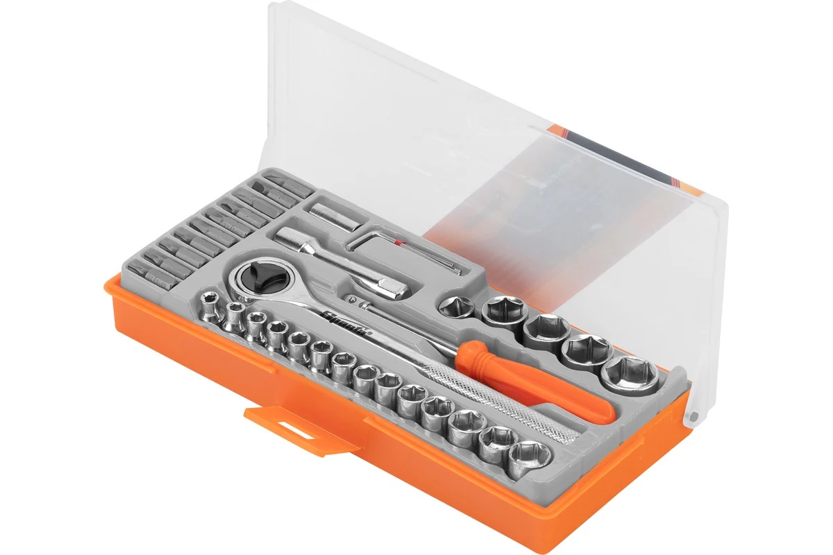 Набор Sparta 13541 содержит 37 предметов для проведения слесарно-монтажных работ. Он оптимально подходит для бытового применения, будет полезен начинающим мастерам. С помощью набора осуществляется монтаж/демонтаж резьбового крепежа. Преимущества. Инструменты и сменные насадки выполнены из инструментальной стали и закалены, что обеспечивает им необходимые прочностные характеристики. Широкий ассортимент торцевых головок в наборе позволяет подобрать нужную в зависимости от крепежа. Реверсивная трещотка позволяет осуществлять монтаж и демонтаж резьбовых соединений. В комплект входит пластиковый диск для удобной эксплуатации реверсивной трещотки. Удлинитель на 3/8 дюйма обеспечивает доступ к резьбовым соединениям в труднодоступных местах. Ярко-оранжевый кейс с прозрачной крышкой позволяет удобно хранить и транспортировать набор, он не потеряется среди инструментов.