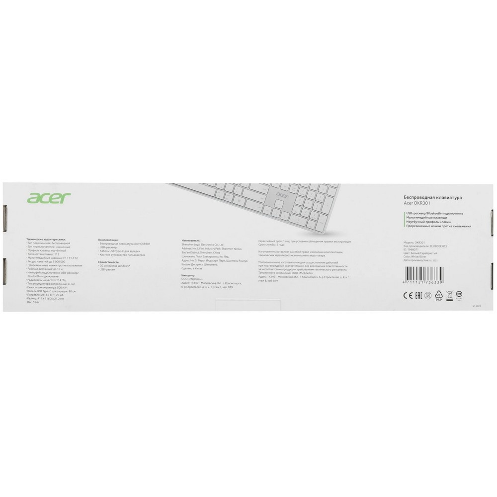 Элегантный белый цвет клавиатуры добавит стиля любому рабочему месту, а вес всего 554 грамма делает ее переноску легкой и удобной. Клавиатура Acer сочетает в себе современные технологии и изысканный дизайн, становясь надежным помощником в ежедневных задачах.