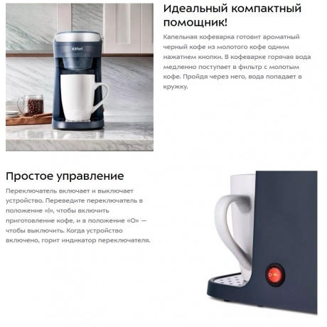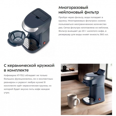 Капельная кофеварка готовит ароматный черный кофе из молотого кофе одним нажатием кнопки. В кофеварке горячая вода медленно поступает в фильтр с молотым кофе. Пройдя через него, вода попадает в кружку. Переключатель включает и выключает устройство. Переведите переключатель в положение «;», чтобы включить приготовление кофе, и в положение «О» — чтобы выключить. Когда устройство включено, горит индикатор переключателя. Пройдя через фильтр, вода попадает в кружку. Многоразовым фильтром можно пользоваться неограниченное количество раз. Сетка фильтра изготовлена из нейлона. Фильтр вмещает до 20 г молотого кофе, а резервуар для воды имеет емкость 360 мл. Кофеварка КТ-7312 обладает не только большим функционалом, но и компактным размером и украсит любую кухню! В комплекте идёт керамическая кружка, из которой будет вкусно пить кофе каждое утро. Кофеварка КТ-7312 удобно разбирается для быстрого ухода – так прибор легко поддерживать в чистоте. Фильтр и воронку важно очищать после каждого использования.