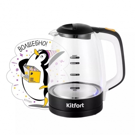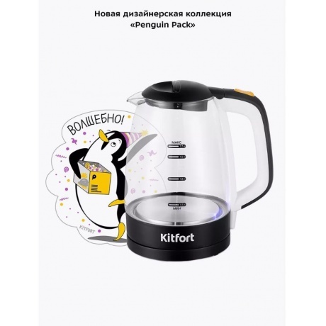 Электрический чайник Kitfort КТ-6633 предназначен для кипячения воды дома, в офисе, на даче. Корпус чайника выполнен из стекла и пластика. Ручка чайника пластиковая, не нагревается и удобно лежит в руке. Полный чайник закипает приблизительно за 6 минут. Нагревательный элемент у чайника в донной части. Сверху он закрыт пластиной из нержавеющей стали, что препятствует образованию накипи, облегчает уход и значительно снижает шум при нагревании воды. При включении чайника загорается подсветка около дна прибора, которая является индикатором работы. Чайник автоматически выключается при закипании и снятии с подставки, имеет защиту от перегрева и включения без воды. Подставка с центральным контактом даёт возможность располагать на ней чайник в любом положении, обеспечивая вращение на 360°. Снизу имеется отсек для хранения шнура, в который можно смотать излишки шнура электропитания, чтобы он не мешал на столе. КТ-6634 выполнен в дизайне коллекции «Penguin Pack», который отражает энергию и яркость нового маскота – пингвина по имени Питер. В комплекте с прибором вы найдёте креативный магнит с этим персонажем. Соберите всю коллекцию китов и пингвинов!
