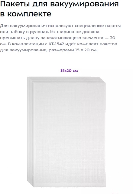 Для долгого и бережного хранения продуктов! Вакууматор Kitfort КТ-1542 - современный прибор, призванный увеличить сроки хранения пищевых продуктов. Продукты, упакованные под вакуумом, сохраняют свежесть и не портятся существенно дольше по сравнению с обычными условиями хранения. Простое управление У KT-1542 есть режимы для вакуумирования сухих и влажных продуктов, запечатывание пакетов без вакуумирования. Также предусмотрен отдельный режим для вакуумирования продуктов в специальных контейнерах (в комплект не входят). Вакуумирование сухих и влажных продуктов В KT-1542 есть возможность вакуумирования сухих и влажных продуктов. Влажные продукты могут намочить край пакета, поэтому время запечатывания необходимо увеличить. В данном режиме время запечатывания будет на 1–2 сек больше. Простая работа – идеальный результат! Открытый край пакета укладывается под крышку прибора, после чего вакууматор начинает выкачивать из него воздух. Контейнер для жидкости можно легко снять и очистить. Прорезиненные ножки не дают скользить по столу во время работы. Помощник в заготовках на даче! Вакуумирование ускоряет засолку, маринование и мочение. В вакууме процесс обработки продуктов такими способами значительно ускоряется. Кроме того вакуумная упаковка останавливает развитие микробов и сохраняет аппетитный внешний вид продукта. Пакеты для вакуумирования в комплекте Для вакуумирования используют специальные пакеты или плёнку в рулонах. Их ширина не должна превышать длину запечатывающего элемента — 30 см. В комплектации с КТ-1542 идёт комплект пакетов для вакуумирования, размерами 15 х 20 см.
