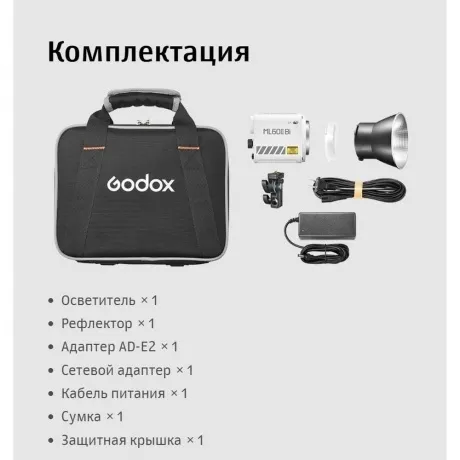 светодиодный осветитель Godox ML60IIBi, адаптер Godox AD-E2, сетевой адаптер питания, рефлектор, крышка светодиода, кабель питания от сети, сумка, руководство по эксплуатации и гарантийный талон, упаковка