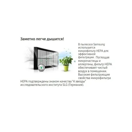 Бытовой пылесос обеспечивает легкую уборку, не занимает много места отличается долговечностью эффективностью работы. Уникальная двухкамерная система Twin Chamber System компании Samsung включает две рабочие камеры, благодаря чему повышается эффективность чистки и сохранение высокой мощности всасывания. Поскольку частицы пыли увлекаются вихревым потоком воздух во внутреннюю камеру, частицы мусора удаляются из потока под действием центробежных сил. В результате крупные частицы пыли и мусора остаются во внешней камере и легко удаляются при опустошении пылесборника. Система позволяет сократить время на трудоемкую процедуру удаления собранной пыли из пылесоса и покупку запасных мешков для сбора пыли.