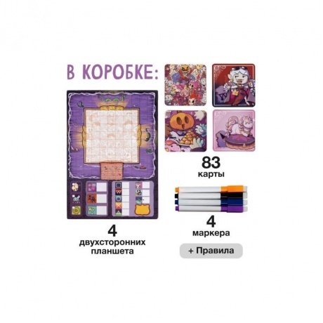 4 двухсторонних планшета 4 маркера 50 карт монстров 5 карт королей/королев монстров 5 карт единорогов 20 карт фигур 3 карты часов