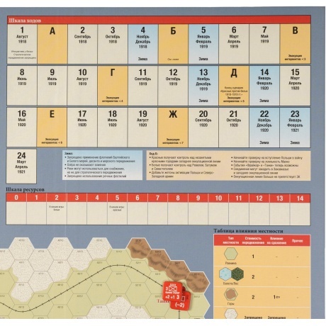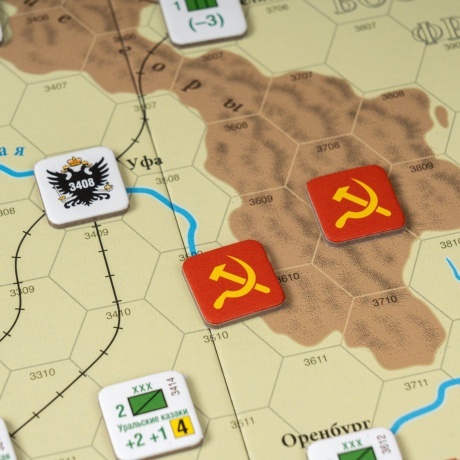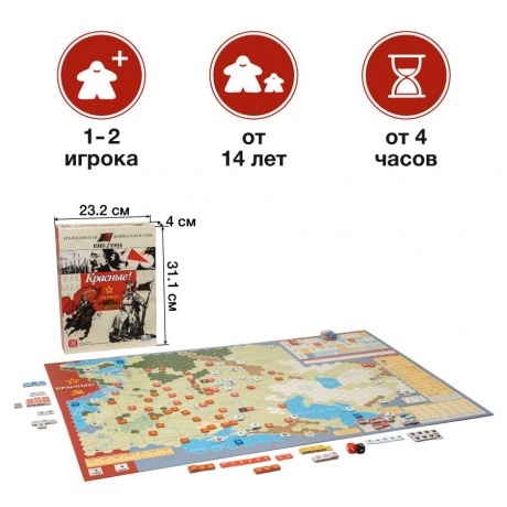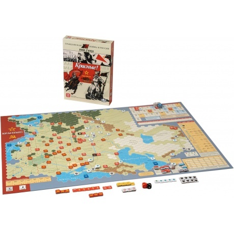Красные! – это дуэльный варгейм, который предоставит вам возможность принять участие в событиях Гражданской войны, охватившей страну с 1918 по 1921 годы. В процессе масштабной партии в эту настольную игру для взрослых и детей от 14 лет вы будете осуществлять управление своими отрядами на большой карте России и соседних стран, принимать множество стратегических решений командования обеих сторон и отыгрывать военные столкновения. Набор сил в игре немаленький – начиная от красных и белых, заканчивая анархистами Нестора Махно, донскими казаками и многими другими. Гражданская война сопровождалась охватившим всю страну полным хаосом и его элементы появляются также и в игровом процессе – так, например, фишки активации хода игроки будут тянуть случайным образом, а две таблицы случайных событий будут вводить в игру совершенно неожиданные моменты – от внезапного появления кавалерии в тылу противников до поставок первых танков и аэропланов! Каждый маркер для красных будет обозначать один подконтрольный им фронт, а для белых – их фракцию. Кроме того, в игре имеется асимметричность, которая обусловлена историчностью – играя за красные отряды, вы будете сильнее и многочисленнее белых, однако, белые более мобильны во время маневров и вариативны при объединении юнитов. Какое влияние окажут на исход войны ваши действияx
