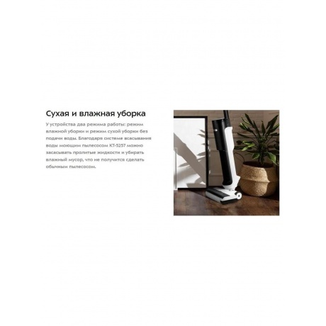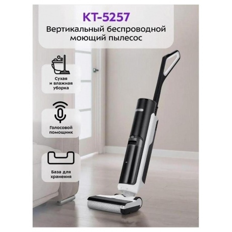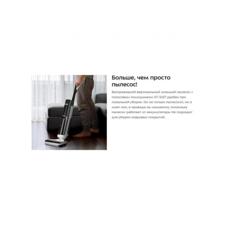 Беспроводной вертикальный моющий пылесос с голосовым помощником KT-5257 удобен при локальной уборке. Он не только пылесосит, но и моет пол, а провода не мешаются, поскольку пылесос работает от аккумулятора. Не подходит для уборки ковровых покрытий. Вертикальный пылесос КТ-5257 оснащен светодиодной подсветкой для комфортной уборки. Подсветка позволяет заметить пыль и мусор, которые при обычном свете можно пропустить. Принцип работы моющего пылесоса КТ-5257 прост: благодаря непрерывному вращению валика, подаваемая на него вода равномерно распределяется по поверхности пола, а затем всасывается пылесосом и попадает в резервуар для грязной воды. У устройства два режима работы: режим влажной уборки и режим сухой уборки без подачи воды. Благодаря системе всасывания воды моющим пылесосом КТ-5257 можно засасывать пролитые жидкости и убирать влажный мусор, что не получится сделать обычным пылесосом.