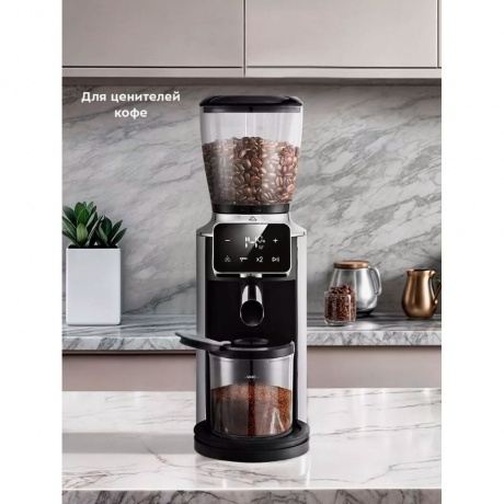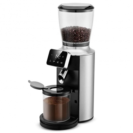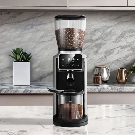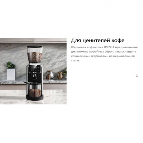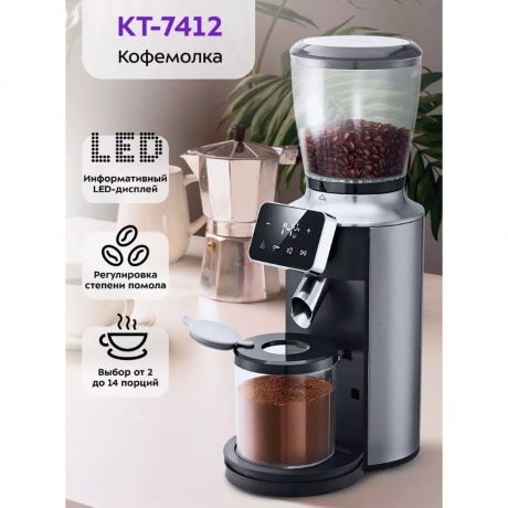 Жерновая кофемолка КТ-7412 предназначена для помола кофейных зёрен. Она оснащена коническими жерновами из нержавеющей стали. Жерновая кофемолка даёт равномерный помол и позволяет настроить его степень от тонкого — для использования в рожковой кофеварке, до грубого — для приготовления кофе во френч-прессе. Вы можете выбрать, на какое количество порций необходимо намолоть кофейных зёрен. Можно установить от 2 до 14 порций с шагом 2 порции. У кофемолки есть LED-дисплей и сенсорное управление, что делает устройство удобным в использовании. Контейнеры для молотого кофе и для зёрен съёмные и закрываются крышками. Внешний жернов также съёмный — для удобства очистки. В комплекте предусмотрена щётка для чистки.