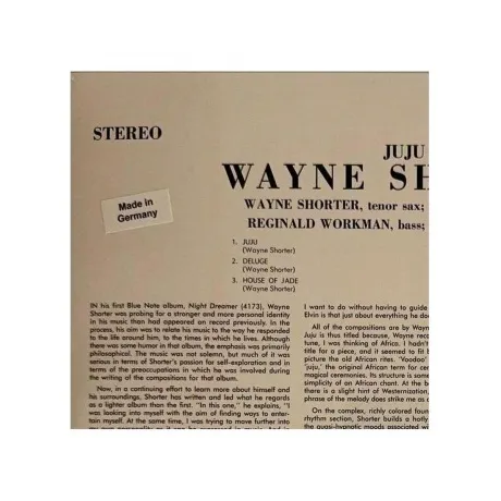 JuJu — пятый альбом американского джазового саксофониста Уэйна Шортера, выпущенный в июле 1965 года. Blue Note Classic Vinyl Edition: стерео, мастеринг Кевина Грея, отпечатано на 180-граммовом виниле Optimal.. Всего через четыре месяца после своего знаменитого дебюта на Blue Note с Night Dreamer, Уэйн Шортер вернулся в студию лейбла в августе 1964 года, чтобы записать следующий альбом JuJu с той же группой (без трубача Ли Моргана). Результатом стал альбом, состоящий исключительно из композиций Шортера, полный идей, отражающий огромное разнообразие влияний и выпускающий их в форме серии захватывающих дух, целостных видений (AllMusic)