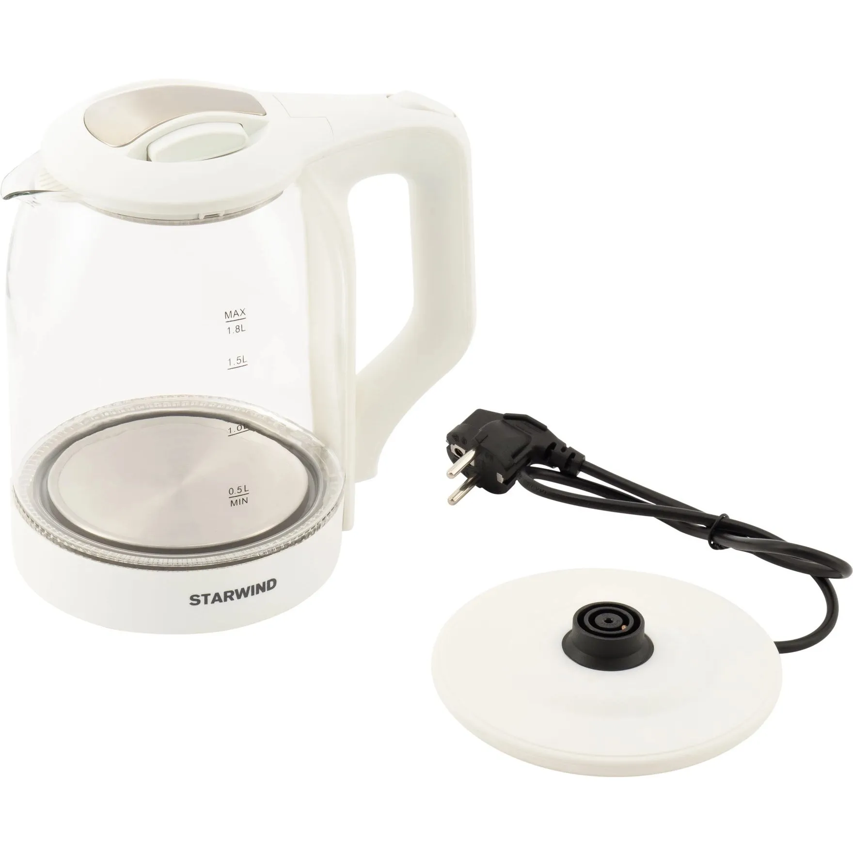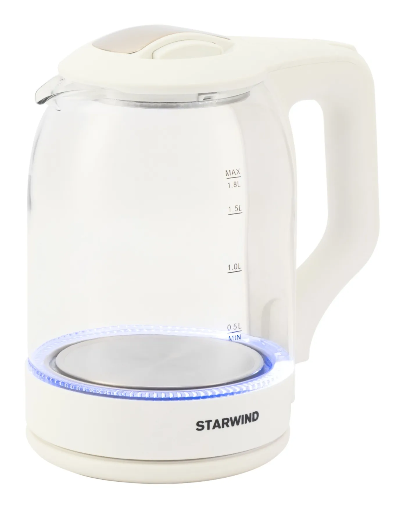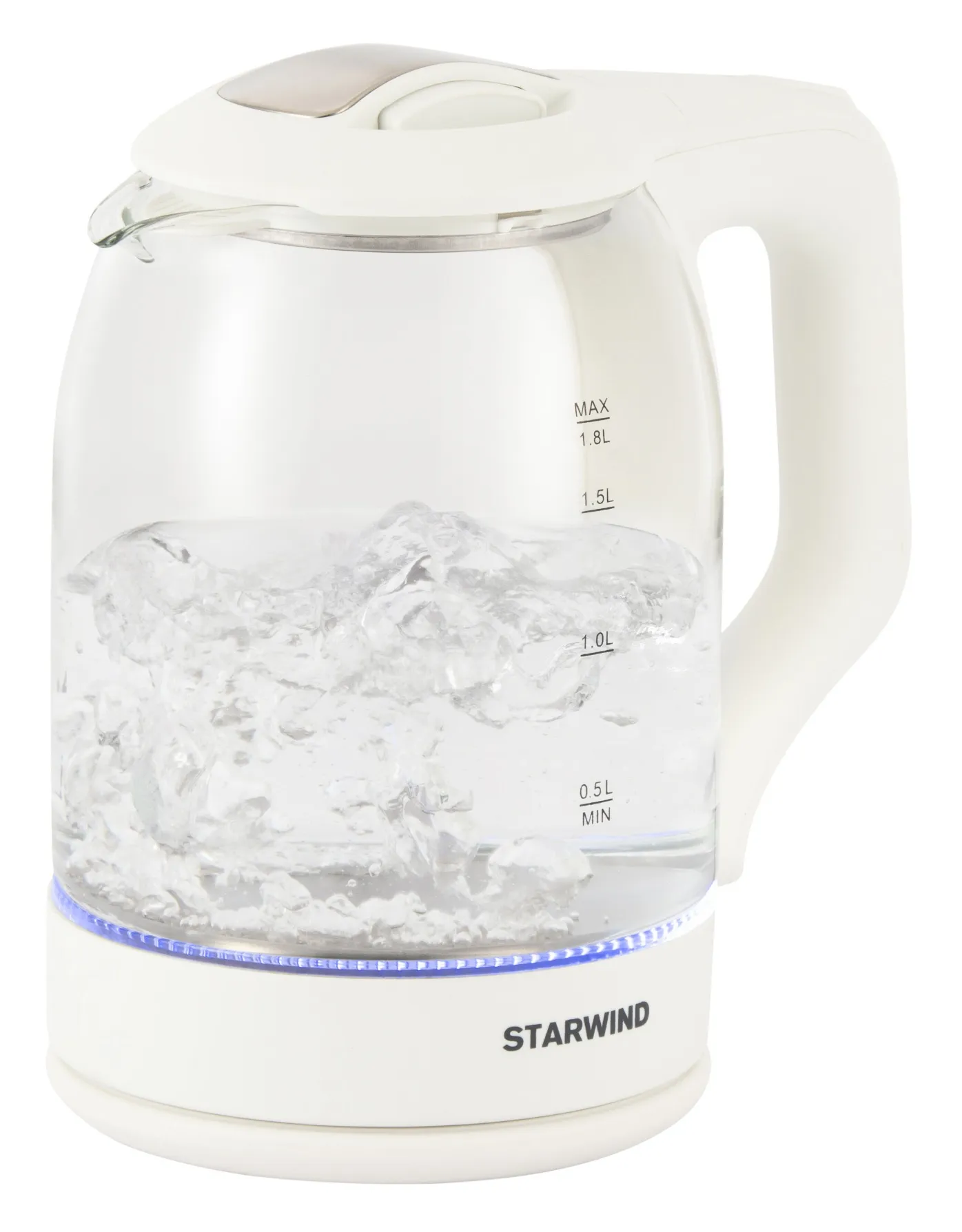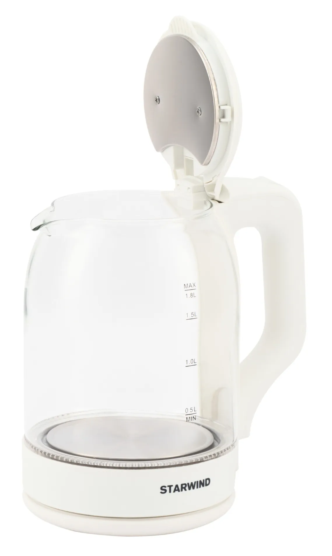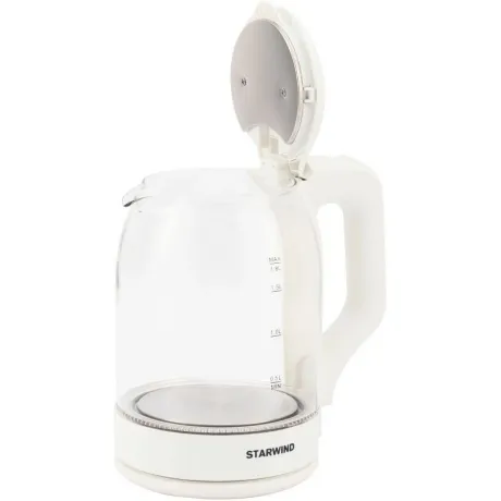 Прозрачный электрический чайник StarWind SKG1056 в стеклянном корпусе белого цвета будет привлекательно смотреться на любой кухне. За счет предусмотренной подсветки воды прибор эффектно работает в темноте. Достаточный объем резервуара позволяет кипятить воду в необходимом количестве. Во время эксплуатации техники светится индикатор. Для удобства использования имеется также и индикатор уровня, который позволяет не переполнить резервуар при наборе воды. Крышка открывается путем нажатия на кнопку. Имеется подставка, которая вращается на 360 градусов, что является дополнительным бонусом при использовании техники по назначению.