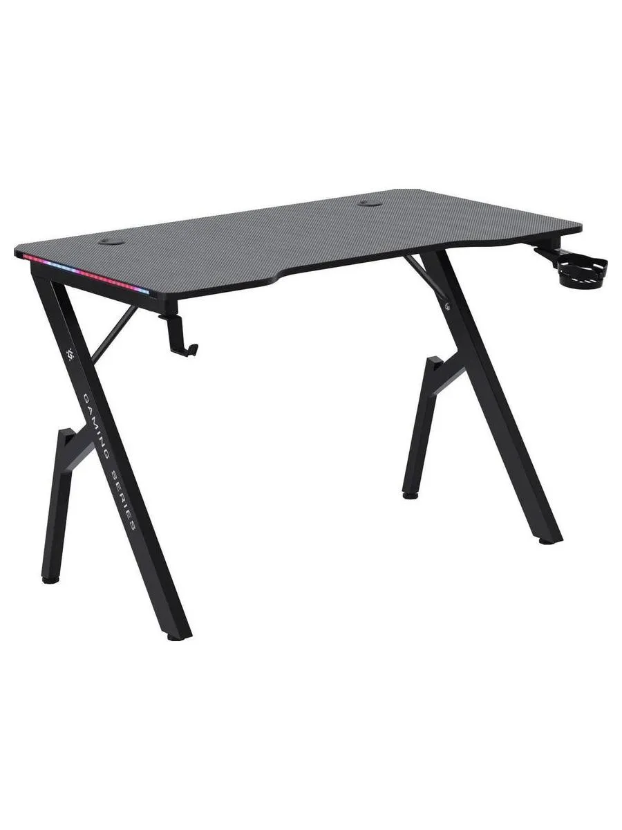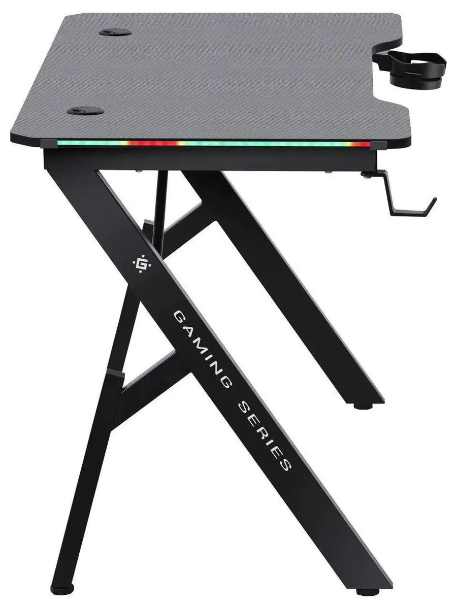 Игровой стол DEFENDER Ino подвес кружка + гарнитура, черный, МДФ, RGB 64074 с RGB подсветкой и с прочными металлическими ножками. Столешница выполнена из МДФ и покрыта прочной меламиновой пленкой с текстурой под карбон. В комплект входят держатели для гарнитуры и кружки, в столешнице предусмотрены 2 выхода для проводов. Длина столешницы 110 см.