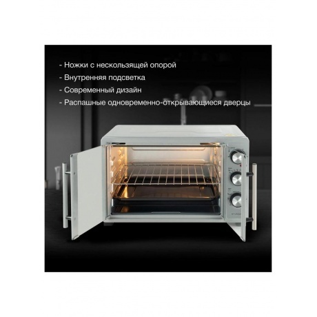 Мини-печь Hyundai MIO-HY077 – верный компактный помощник для любой хозяйки и любителей кулинарии. Внешне данная модель по габаритам скорее напоминает микроволновую печь, чем полноценный громоздкий духовой шкаф. Однако она ничем не уступает ему в функциональности. Прибор может нагревать блюдо снизу, сверху или с обеих сторон сразу, с конвектором или без него. Также в нём можно и быстро разморозить любой продукт – для этого предусмотрен отдельный режим одного из поворотных регуляторов. Всего таких переключателей три: один отвечает за температуру, второй – за направление нагрева и активацию циркуляции воздуха, а третий – это таймер с максимальным временем до 120 минут. Подобная вариативность способов настройки позволяет готовить любые кулинарные шедевры, точно соблюдая их изначальную рецептуру. Благодаря мощности 1500 Ватт Hyundai MIO-HY077 быстро разогревается до заданной температуры, а максимальная для неё – 250 градусов. Этого вполне достаточно даже для блюд, требующих высокого жара в течение короткого времени. Таких, как пицца или небольшие пироги. В данном приборе они будут идеально приготовлены до хрустящей корочки без риска пригорания. Для удобства данная модель оснащена двумя прозрачными стеклянными дверцами, открывающимися вертикально. Такая конструкция упрощает извлечение противня или решётки и позволяет наблюдать за процессом готовки. Но стекло не только помогает следить за готовностью пищи, но и отлично держит жар. Ножки мини-печи Hyundai MIO-HY077 изготовлены из нескользящего прорезиненного материала, так что устойчиво стоят на любой поверхности и не двигаются.