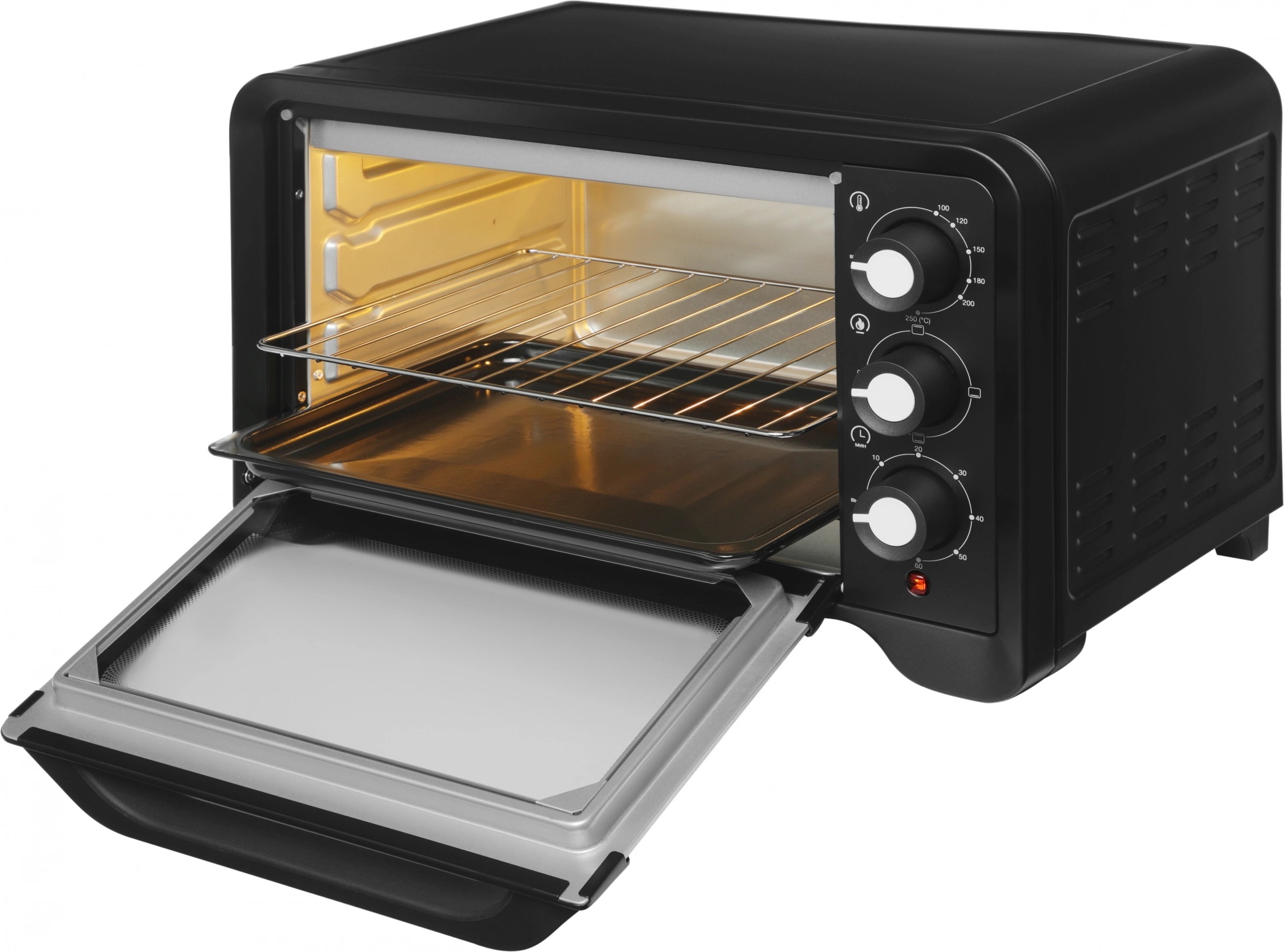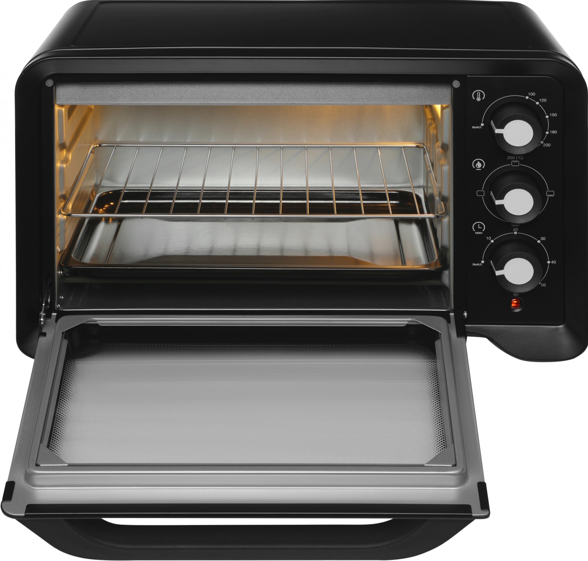 Встроенный таймер рассчитан на 60 минут, а световой индикатор подсказывает, что устройство находится в работе. Благодаря двойному жаропрочному стеклу дверца надёжно удерживает тепло внутри, снижая теплопотери и повышая безопасность использования.
