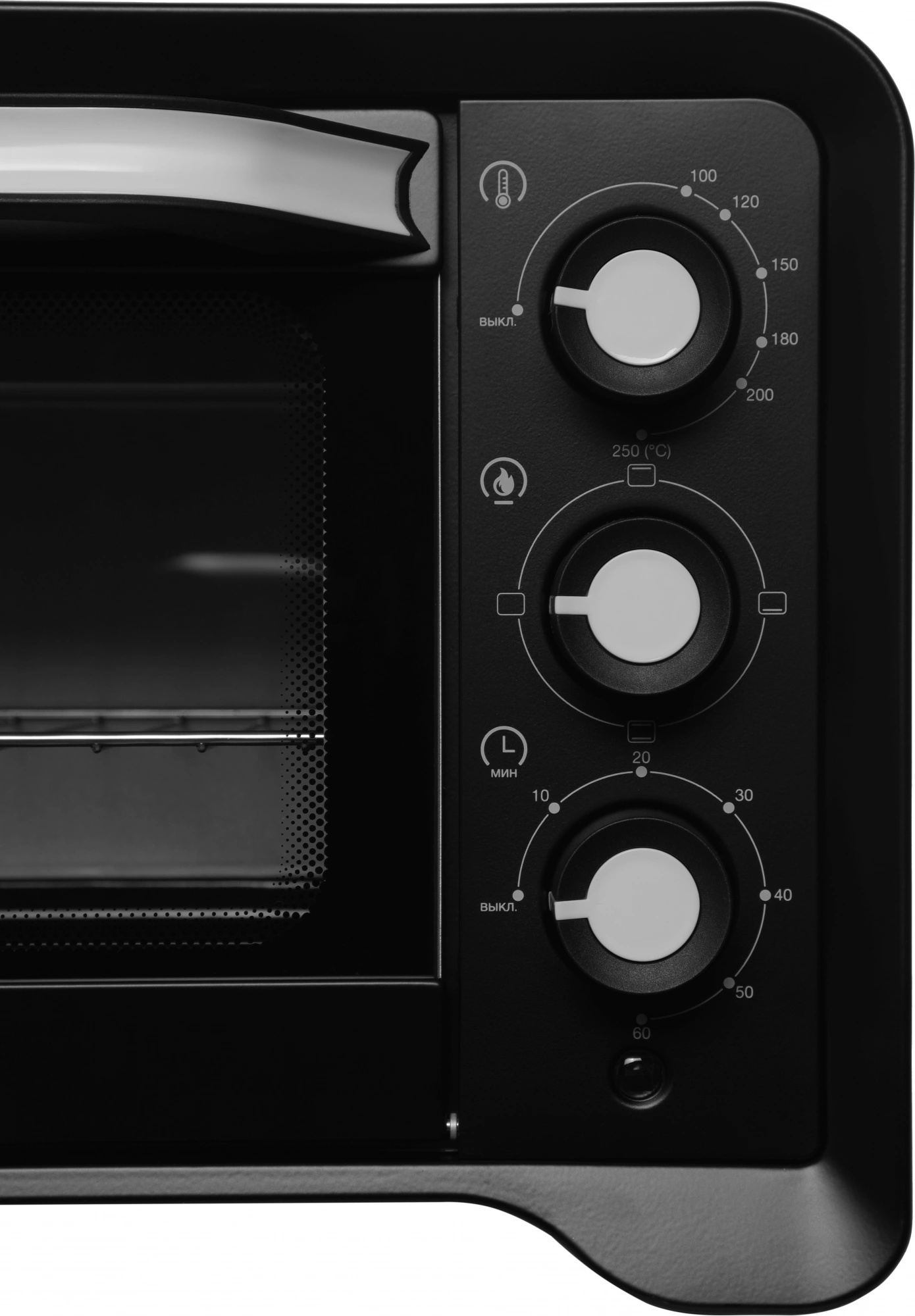 Механическое управление реализовано с помощью трех поворотных регуляторов: температурного, выбора режима нагрева и таймера. Панель интуитивно понятна и легко настраивается — достаточно пары движений, чтобы запустить нужный режим.