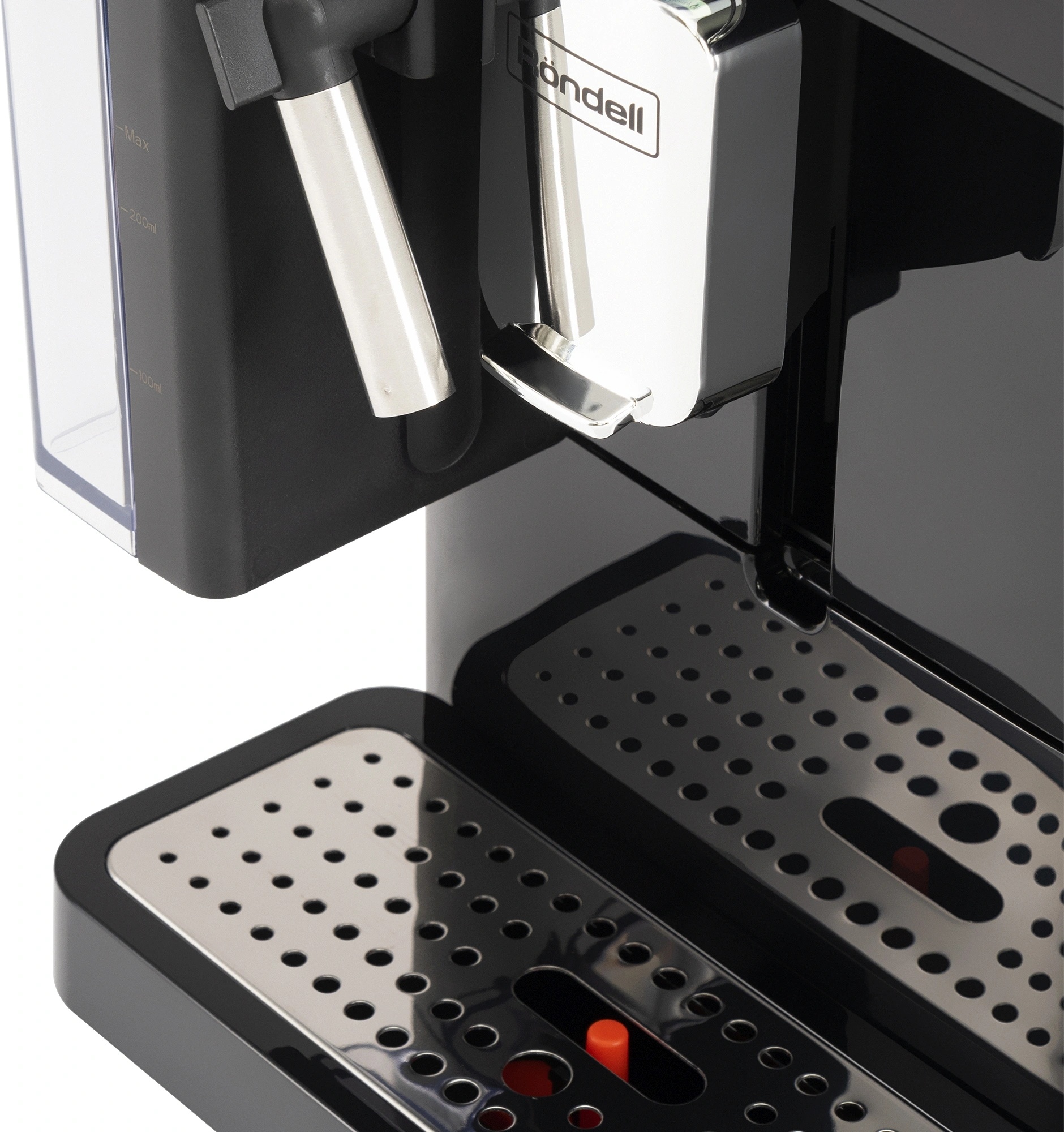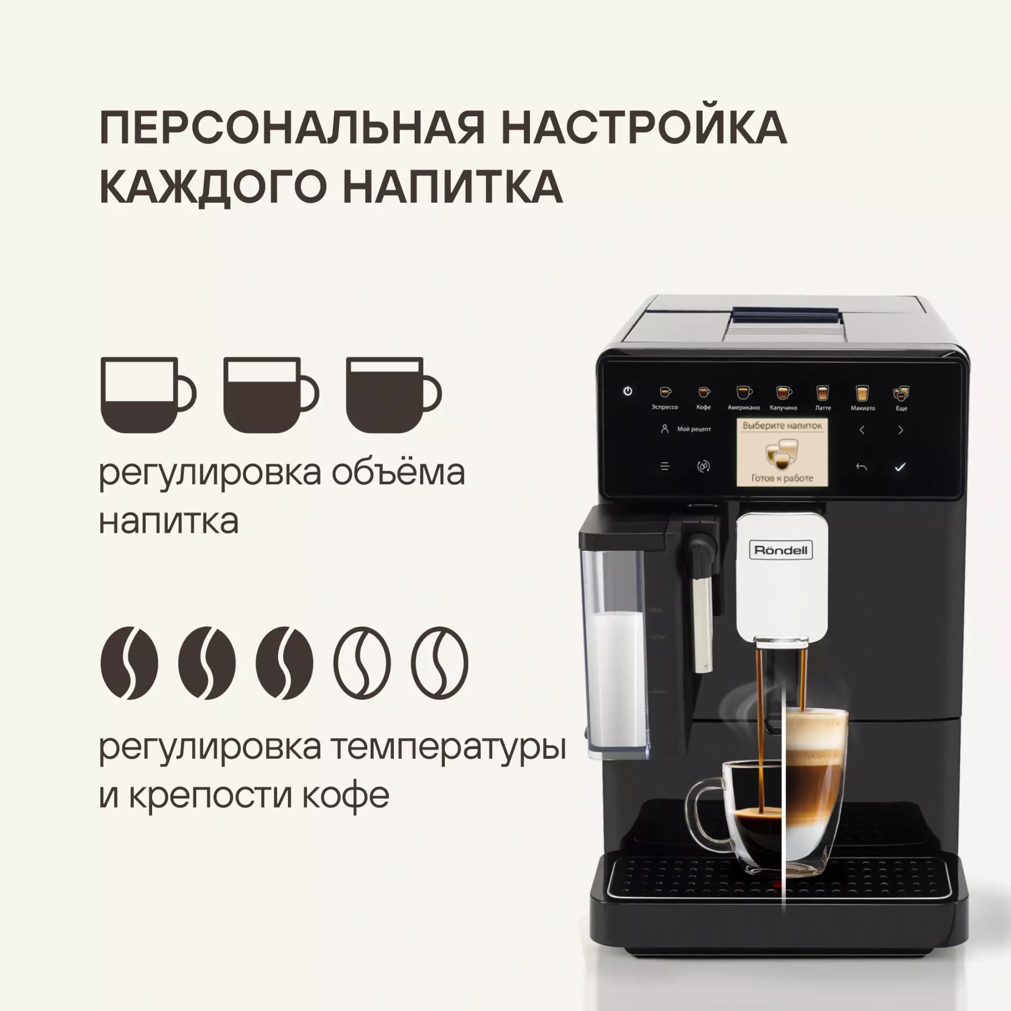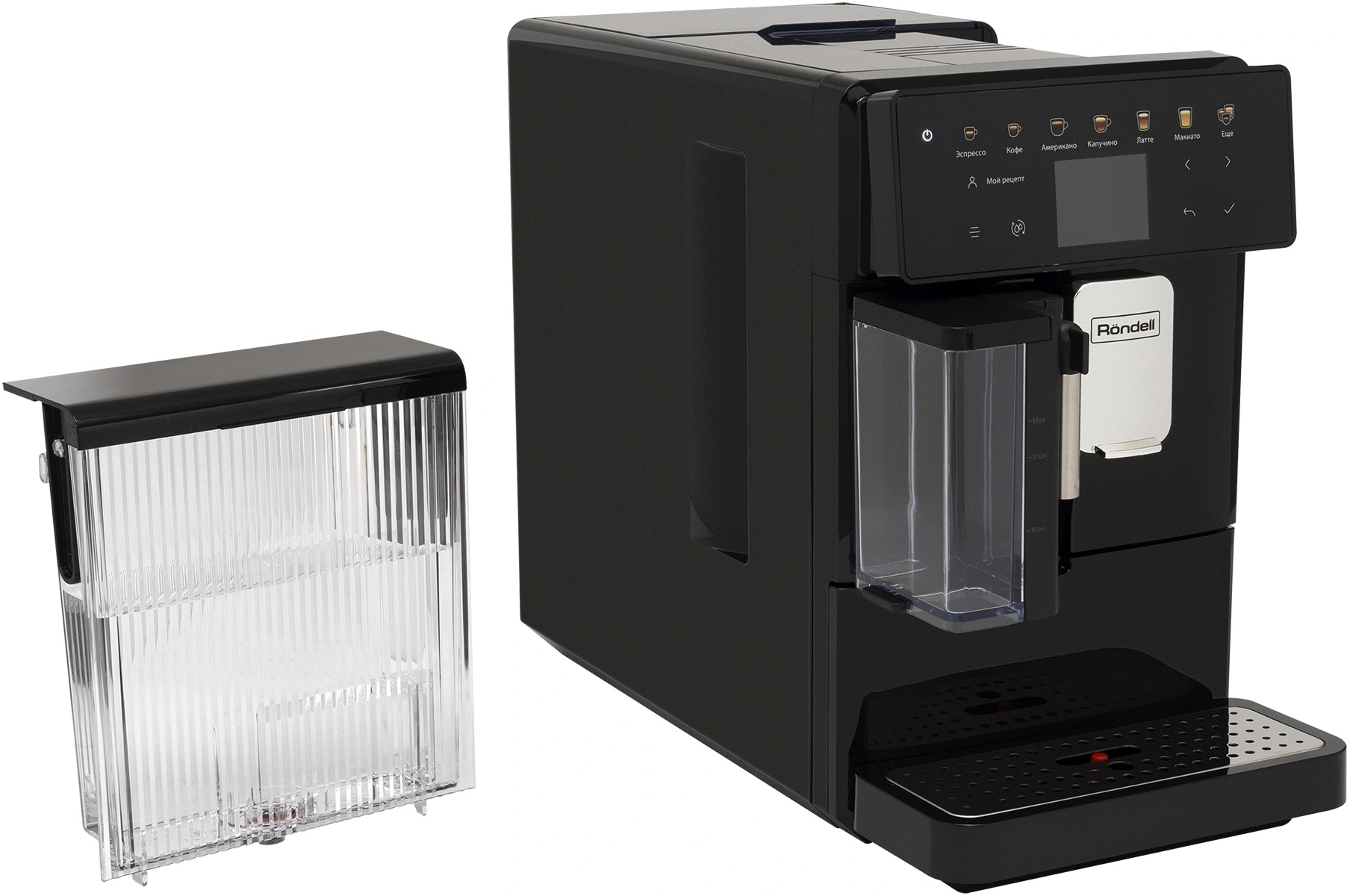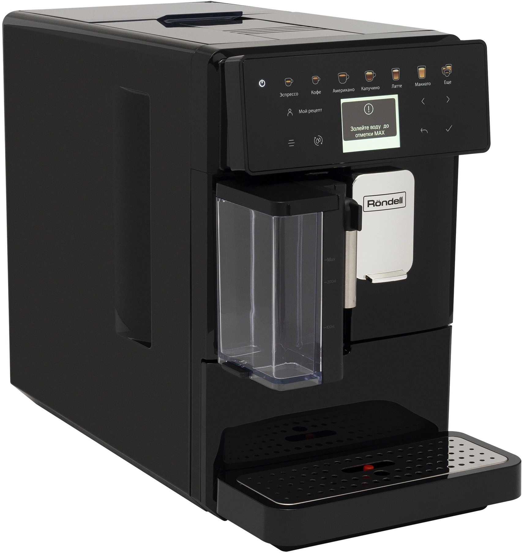 Кофемашина Rondell RDE-1116 мощностью 1400 Вт готовит напитки на основе кофе и молока (эспрессо, латте, капучино, макиато, лонг блэк, ристретто, лунго, флэт уайт) и подогревает воду для чая.