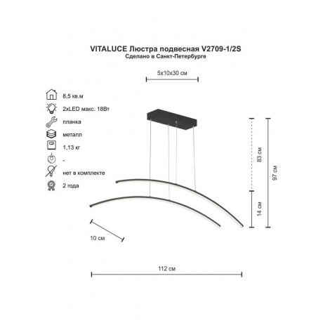 подвесная люстра vitaluce v2709-1/2s, оснащена светодиодными лампами мощностью 18 вт, цветовая температура 4000 к, световой поток 1690 лм, предназначена для освещения площадей до 8,5 кв.м.
