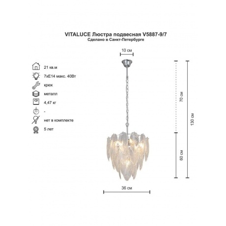 подвесная люстра vitaluce v5887-9/7, предназначенная для зала, имеет 7 ламп e14 с максимальной мощностью 40 вт каждая, общая мощность 280 вт, напряжение 220 в, степень пылевлагозащиты ip20, гарантийный срок 5 лет.