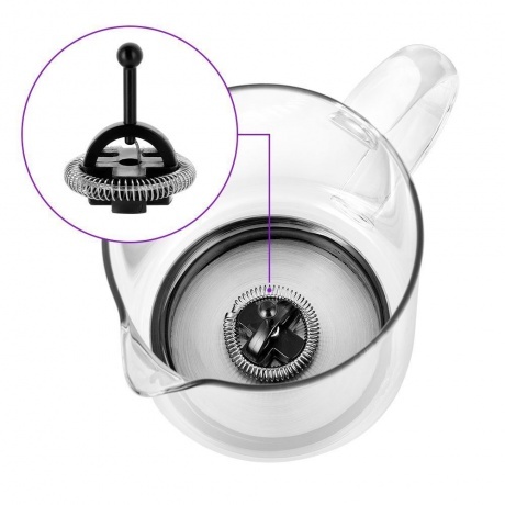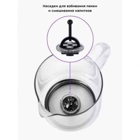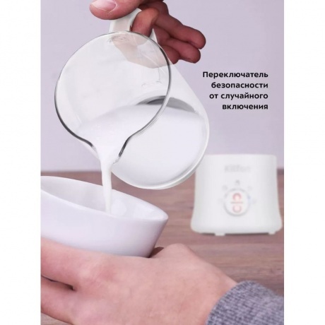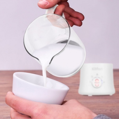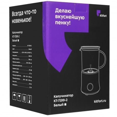 Вспениватель-кувшин Kitfort КТ-7199 представлен в белом корпусе с индикацией выбранного режима. Чаша на 780 мл дополнена внутренними отметками литража для точного соблюдения пропорций. Для получения пенки без риска разбрызгивания объем молока не должен превышать 250 мл. Kitfort КТ-7199 с электронным управлением оснащен пятью режимами вспенивания и функцией подогрева. Длины кабеля 70 см хватает для подключения вспенивателя к розетке рядом со столом. Система автоотключения не требует внимательного контроля за рабочим процессом. Вы можете использовать устройство для подогрева 350 мл молока без дальнейшего взбивания.