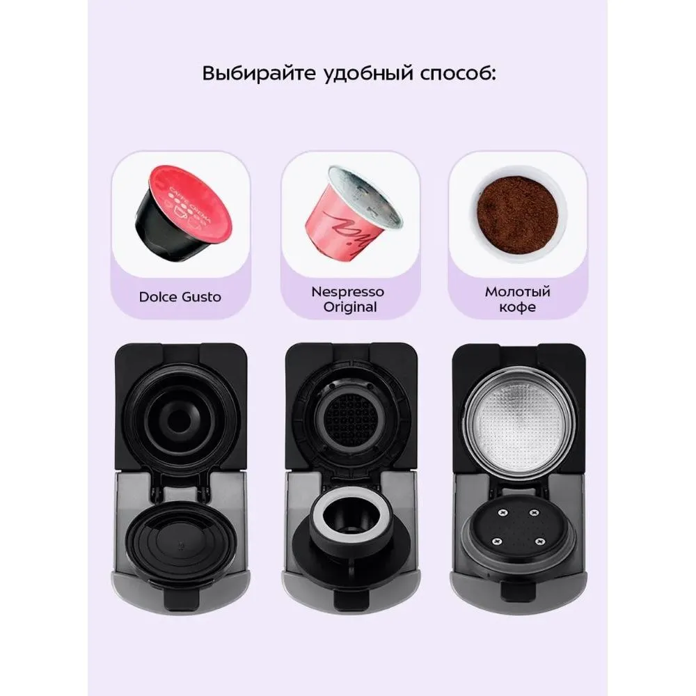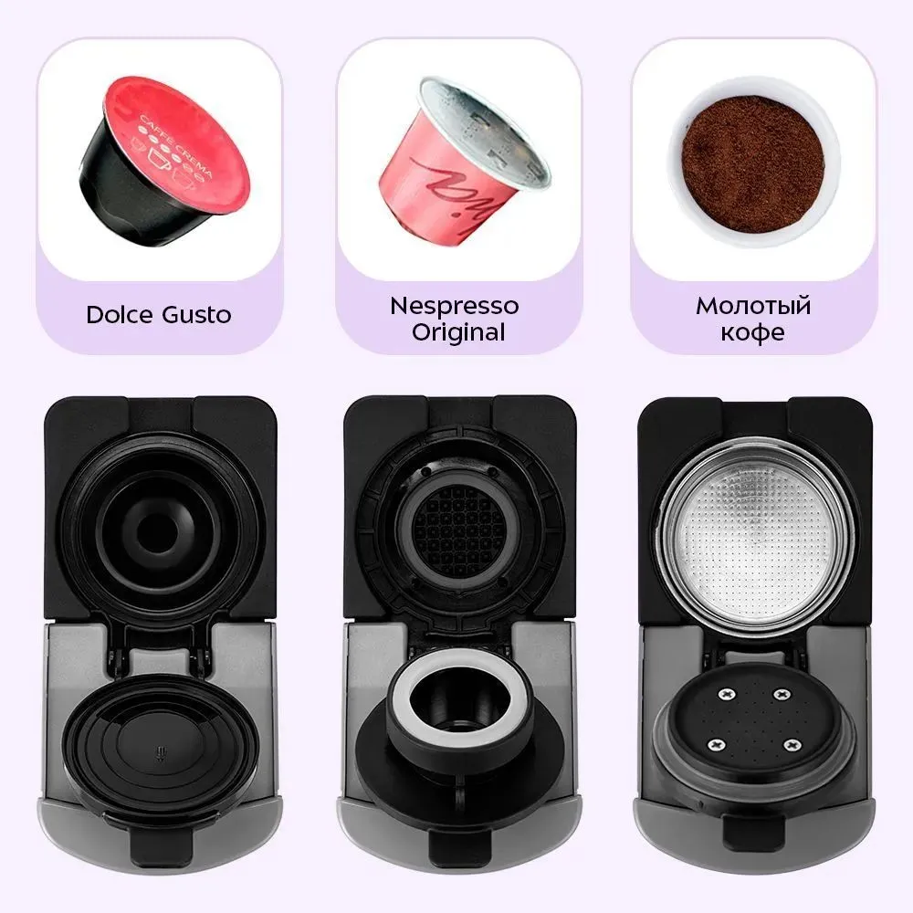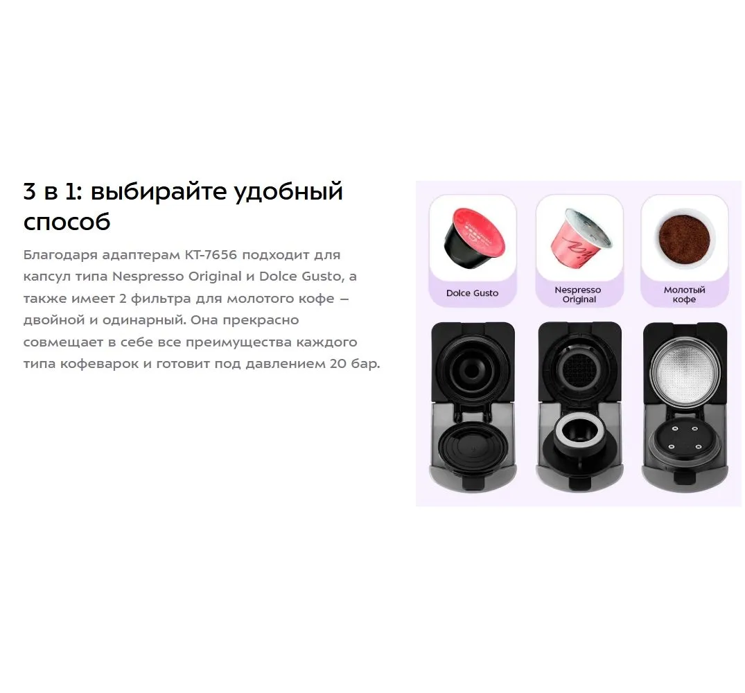 Кофеварка «3 в 1» КТ-7656 – многофункциональное устройство, сочетающее в себе функции капсульной и рожковой кофеварки. Она поможет приготовить эспрессо или лунго, а также множество других кофейных напитков на ваш вкус.