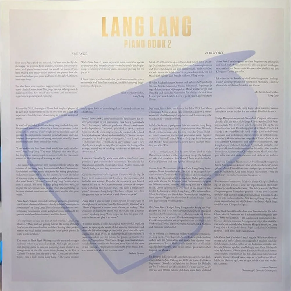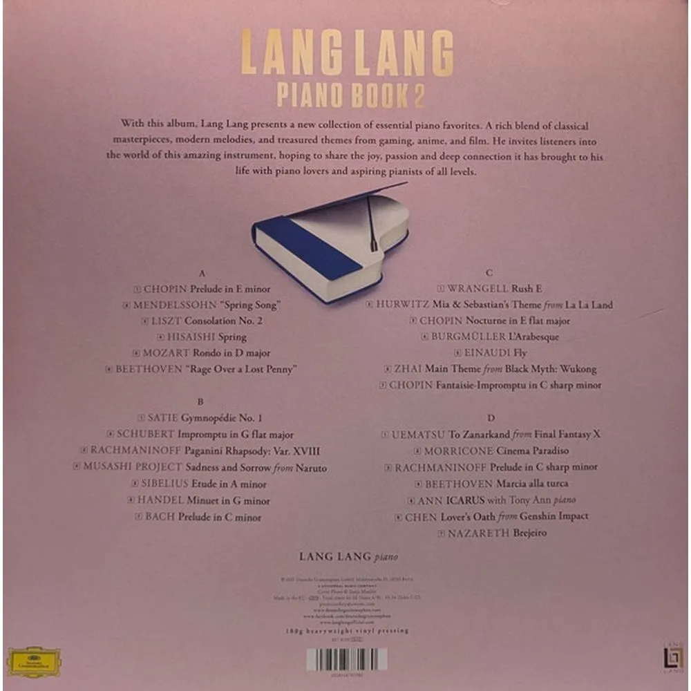 Новый альбом всемирно известного китайского пианиста Лан Лана. Винил, 180 грамм. В своём альбоме, который выйдет в конце 2025 года, звёздный пианист Лан Лан продолжает концепцию своего всемирно успешного и популярного альбома «Piano Book»: «Piano Book 2» содержит новую личную подборку любимых фортепианных мелодий Лан Лана – «шедевров в миниатюре», как он их называет. Нестареющая классика фортепианной литературы и известные современные композиции, дополненные культовыми произведениями из фильмов, аниме и игр, создают разнообразную коллекцию, которая порадует пианистов и любителей фортепиано всех возрастов. «Надеюсь, эти произведения вдохновят вас открыть для себя новые сокровища, заново открыть знакомые мелодии и возродить радость игры на фортепиано». (Лан Лан)