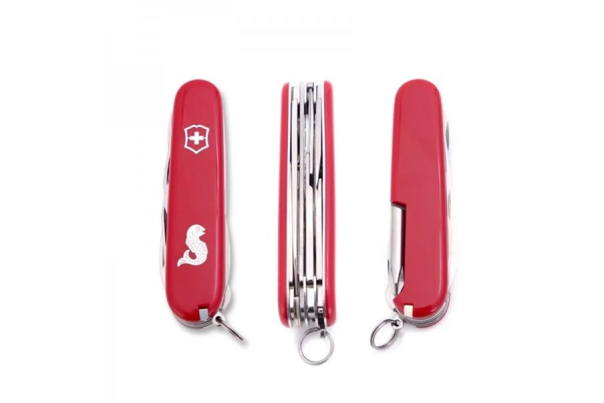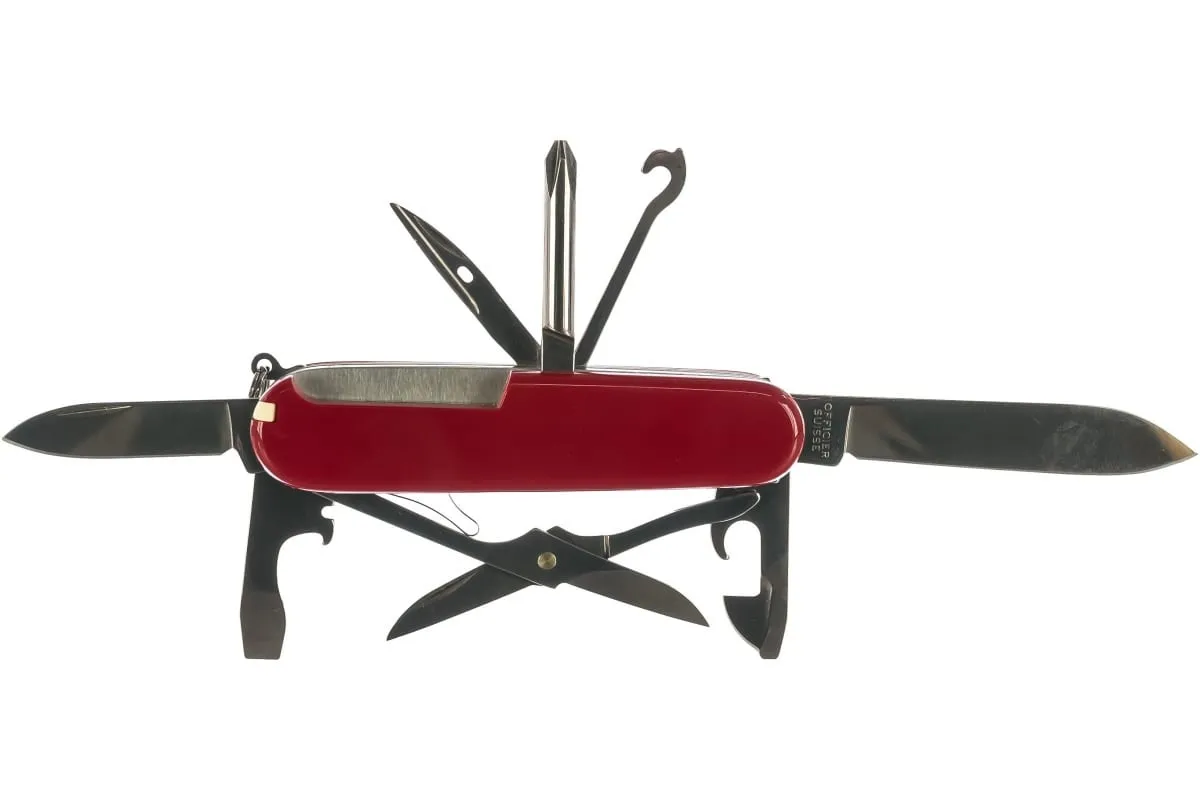 большое лезвие, малое лезвие, крестовая отвертка, консервный нож, малая отвёртка, открывалка для бутылок с отвёрткой, инструмент для снятия изоляции, шило, кернер, кольцо для ключей, пинцет, зубочистка, ножницы, многофункциональный крючок, инструмент для чистки рыбы, инструмент для извлечения рыболовного крючка, линейка