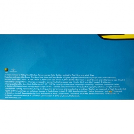 Хорошая полиграфия. Внутренний, бумажный пакет с полиэтиленовой прослойкой. На развороте альбома, можно увидеть изображения битлз, с одноименного мультфильма, а на тыльной стороне находится трек-лист. Яркое оформление, отличный звук, европейское издание.