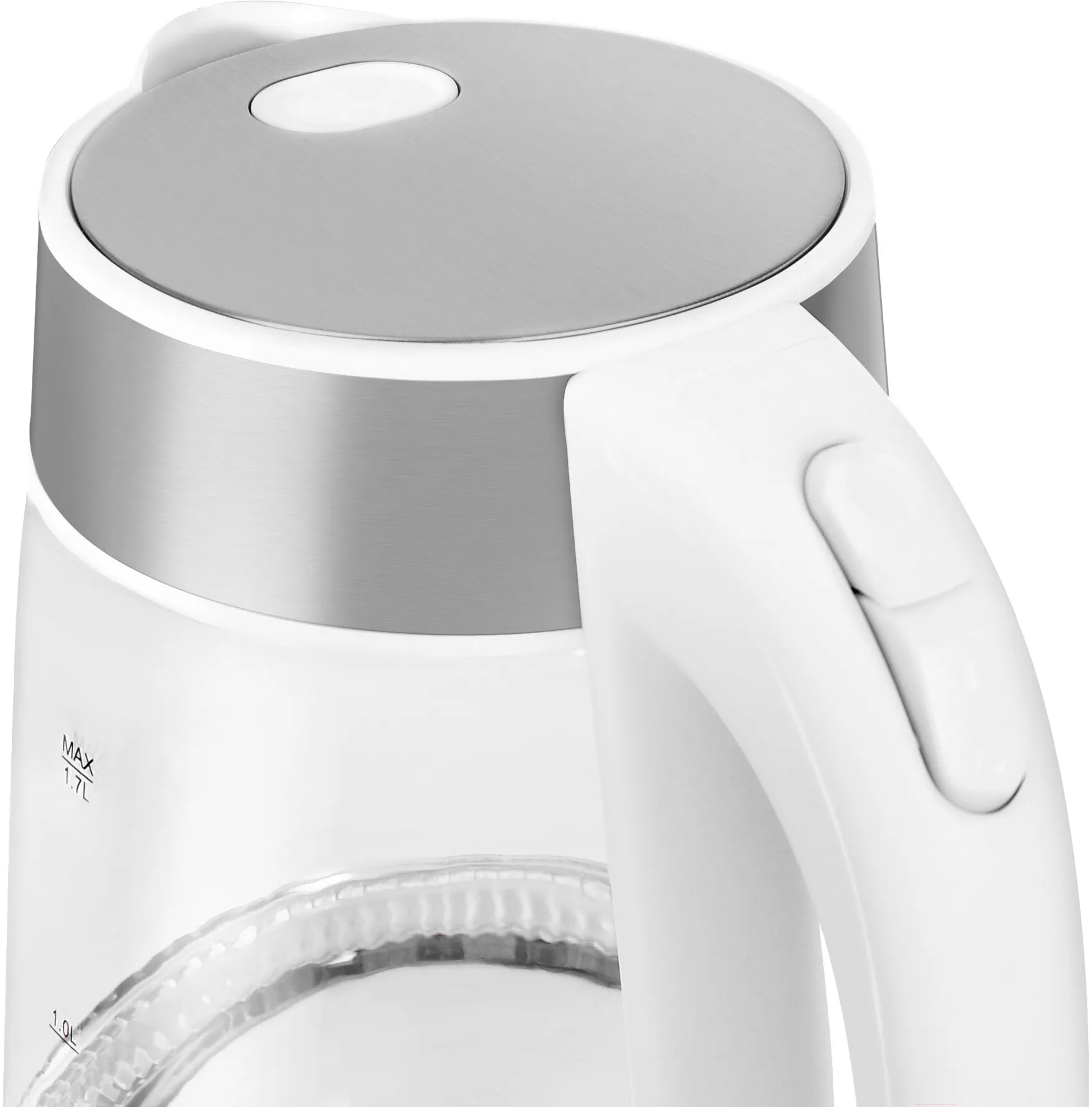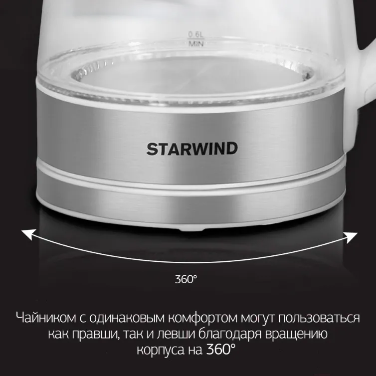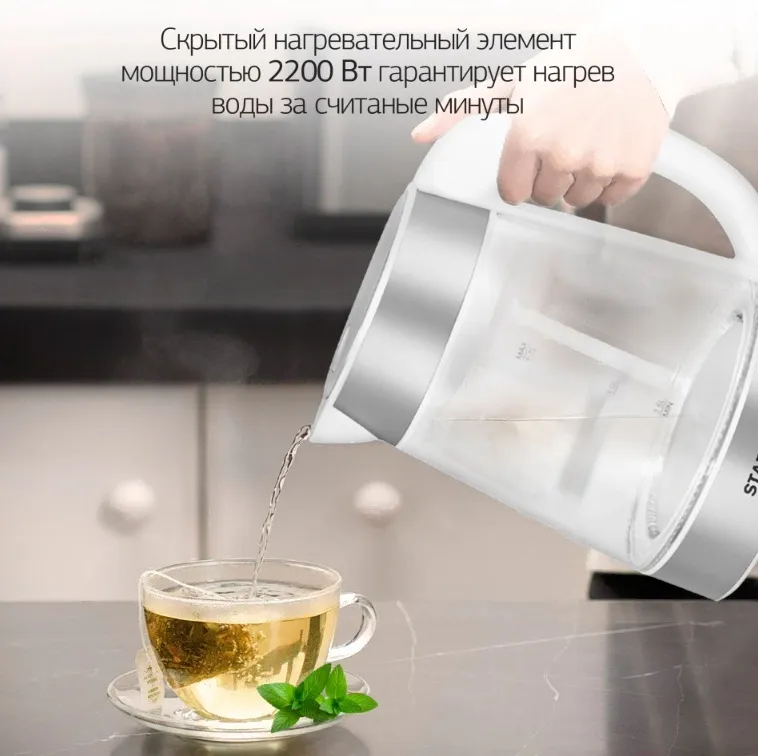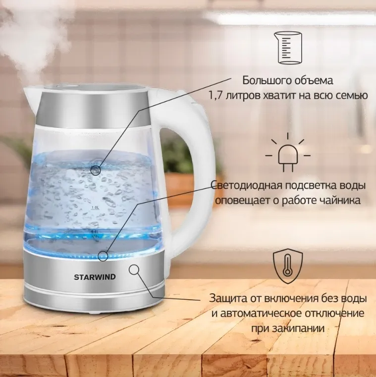 Чайник Starwind SKG2011 – устройство, которое привлекает внимание ярким современным дизайном, станет украшением интерьера вашего кухонного пространства. Мощность этого чайника составляет 2 кВт, а объем резервуара для питьевой жидкости – 1,7 литра. Выполнен в классическом белом цвете, дополнен уникальными серебристыми вставками. Корпус изготовлен путем совмещения стекла и пластика. В конструкции предусмотрена подсветка, поворачивать чайник можно на 360 градусов. Имеется встроенная мультиподсветка шкалы уровня питьевой воды, которая позволит создать на кухне уютную атмосферу.