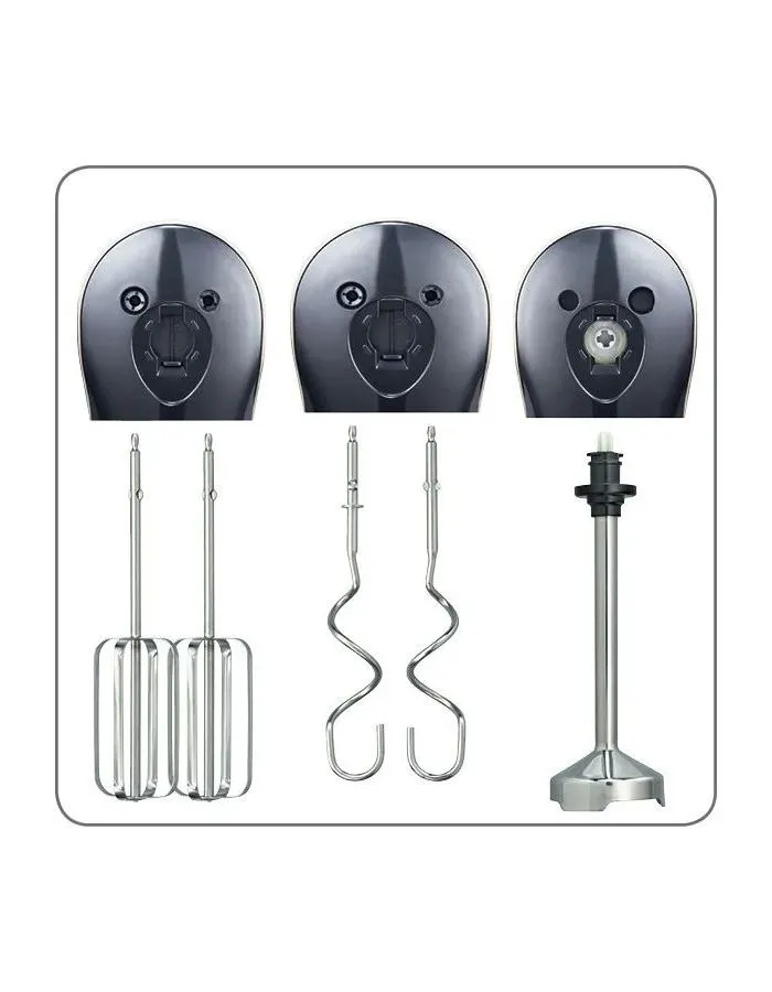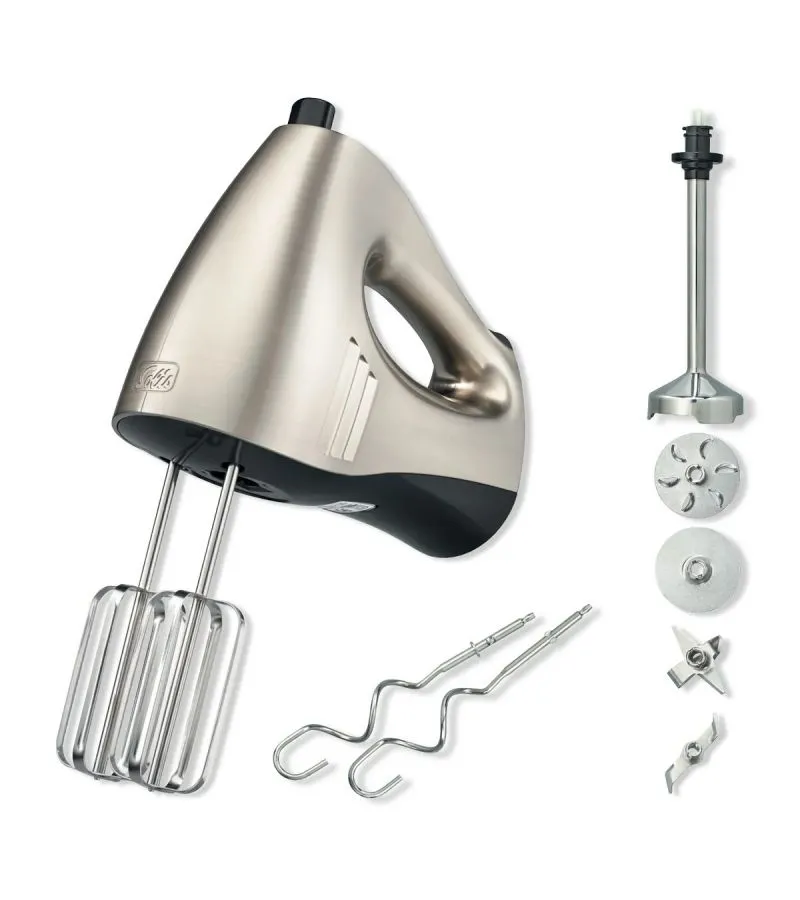 Solis 8371 — прибор, который сочетает функции ручного миксера и блендера. Он комплектуется венчиками для взбивания, крюками для вымешивания теста и погружной насадкой. Для хранения устройства и аксессуаров прилагается контейнер-подставка. Мощный 400-ваттный мотор обеспечивает быстрое решение всех кулинарных задач. У прибора 16 скоростей, активные установки и продолжительность работы в минутах и секундах отображает цифровой ЖК-дисплей. Для лучшего обзора он подсвечивается. Кнопки управления удобно расположены под большим пальцем — менять настройки можно прямо в процессе работы. Эргономичная ручка снабжена мягким покрытием, препятствующим скольжению в ладони.