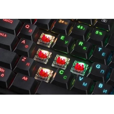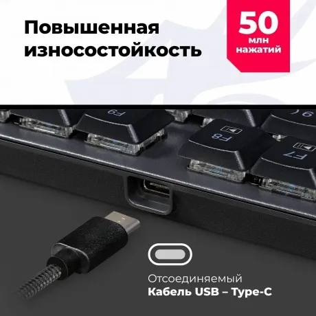 104 клавишная клавиатура в слим исполнении - идеальный вариант для игр и работы. Клавиатура имеет тихие красные переключатели, RGB подсветку и отсоединяемый кабель.
