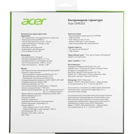 Гарнитура Acer OHR303 – это функциональное устройство, которое станет незаменимым помощником в работе и развлечениях. Гарнитура Acer OHR303 оснащена беспроводным подключением, что обеспечивает свободу движений и удобство использования. Радиус действия беспроводной гарнитуры составляет 10 метров, что позволяет комфортно общаться с собеседниками на значительном расстоянии. Устройство имеет встроенный аккумулятор емкостью 1100 мАч, что обеспечивает до 12 часов работы на одном заряде. Это позволяет использовать гарнитуру в течение длительного времени без необходимости постоянной подзарядки.