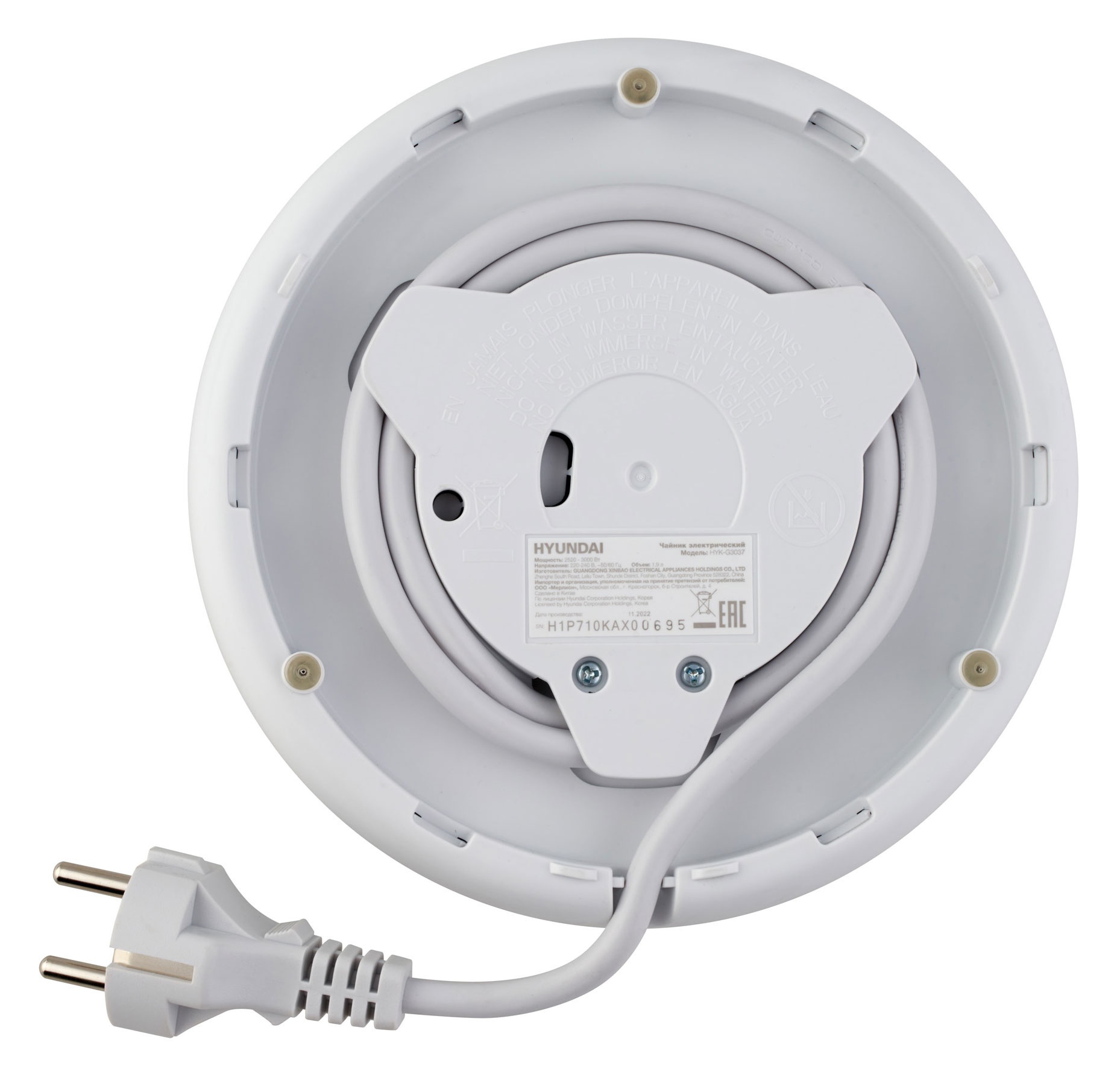 Под эргономичной рукоятью чайника располагается клавиша включения и яркий световой индикатор его работы. Жидкость во время нагрева также подсвечивается. В конце цикла Hyundai HYK-G3037 выключается автоматически. Без воды прибор и вовсе включиться не может, для этого в нём установлена соответствующая система.