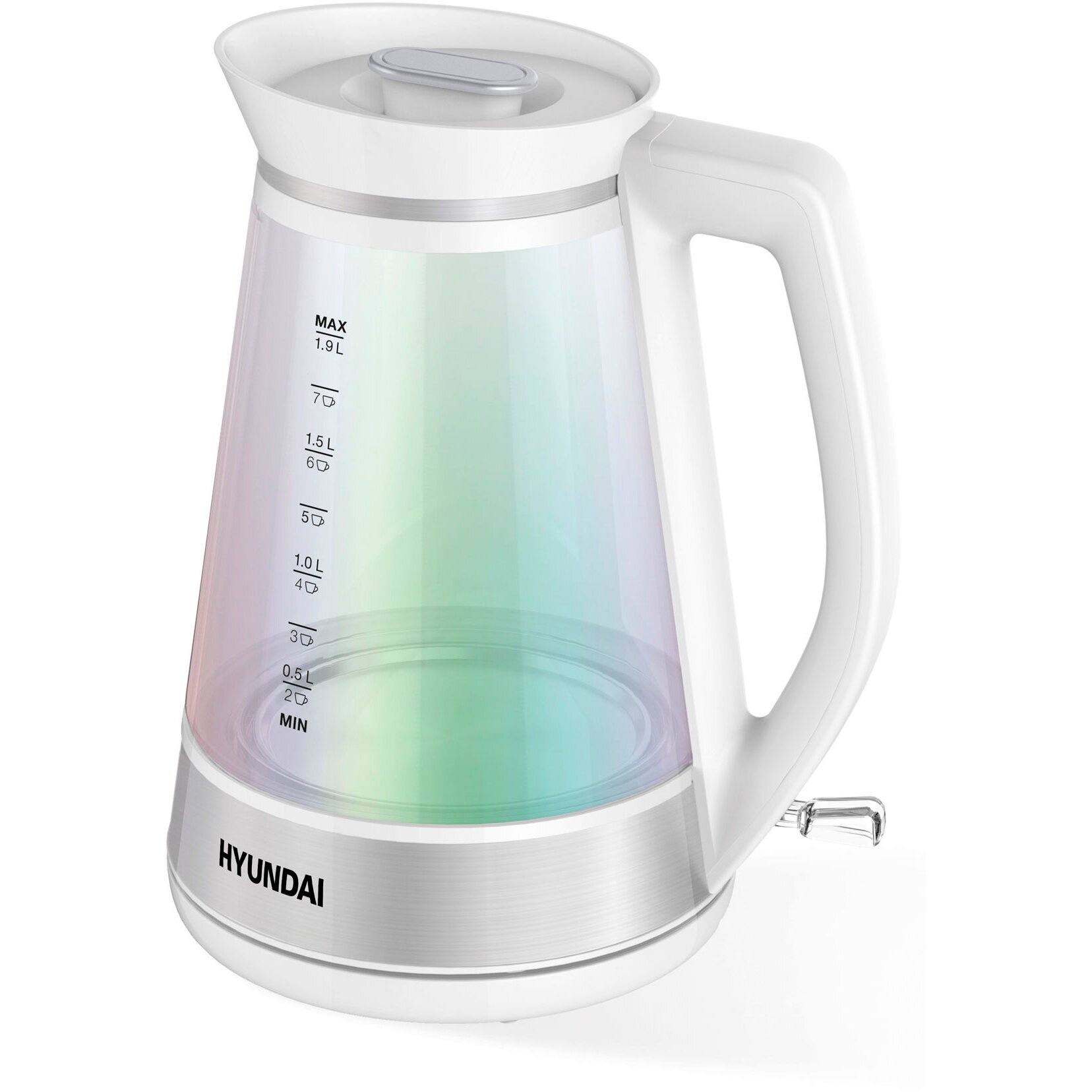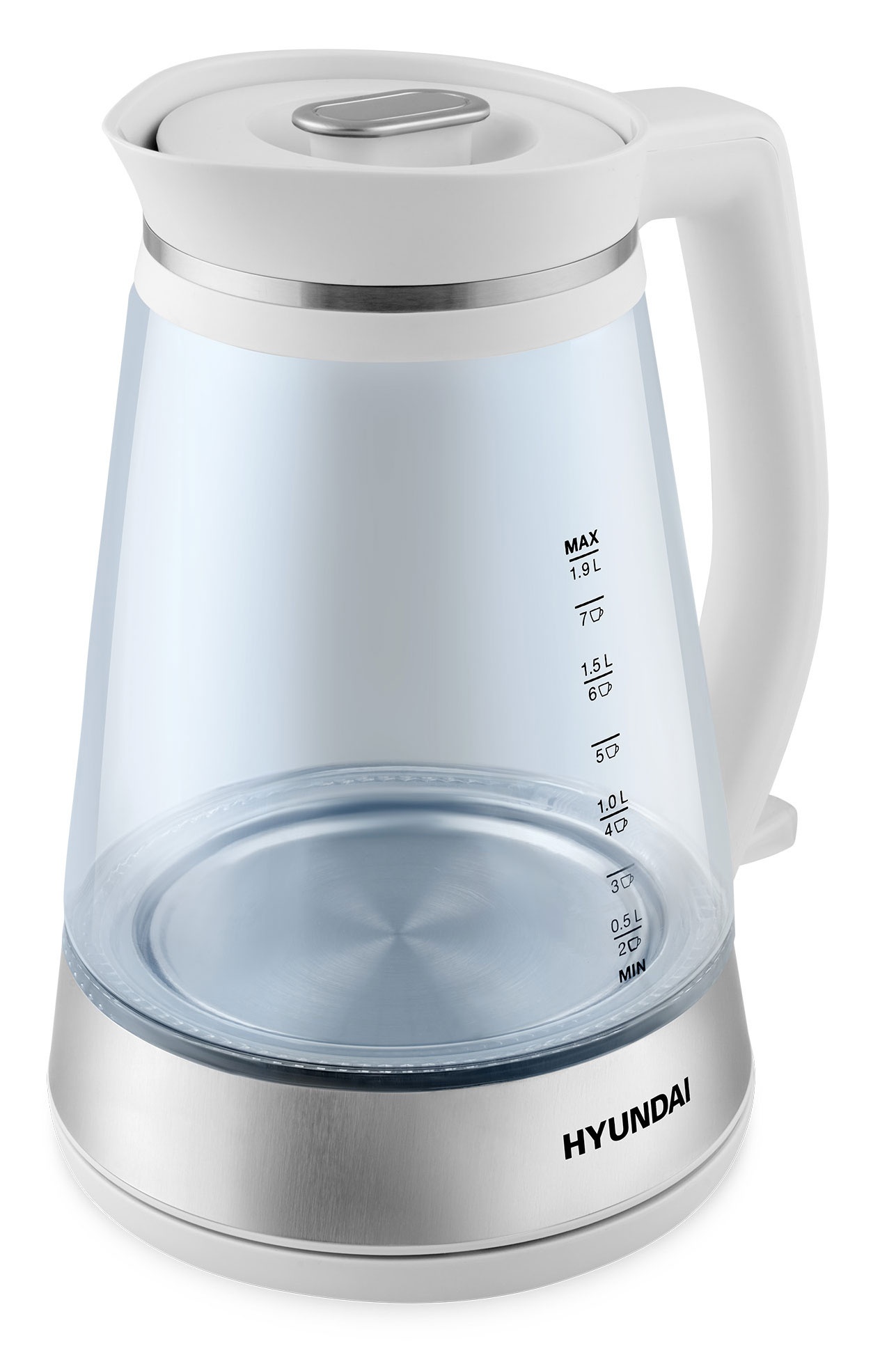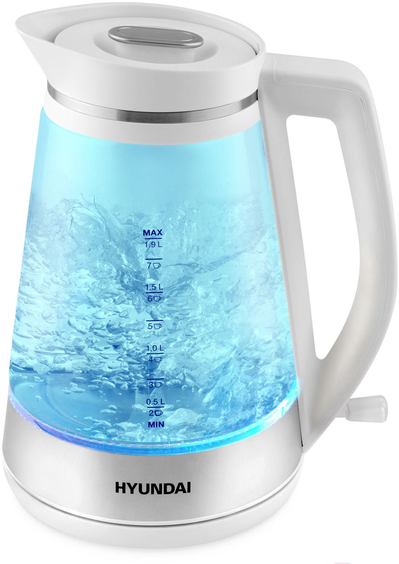 Мощность прибора составляет 3000 Вт. Этого вполне достаточно, чтобы за считанные минуты довести 1,9 л помещающейся в нём жидкости до состояния кипения. Стенки данной модели сделаны из стекла, которое обеспечивает долгое сохранение температуры, а специальный пластик, ставший основным материалом крышки, рукояти и нижней части, обеспечивает лёгкость и прочность девайса, а также не выделяет вредных примесей при нагреве. Полупрозрачные боковые стенки Hyundai HYK-G3037 размечены рисками с указанием объёма налитой воды. Измерение приведено в литрах и чашках.