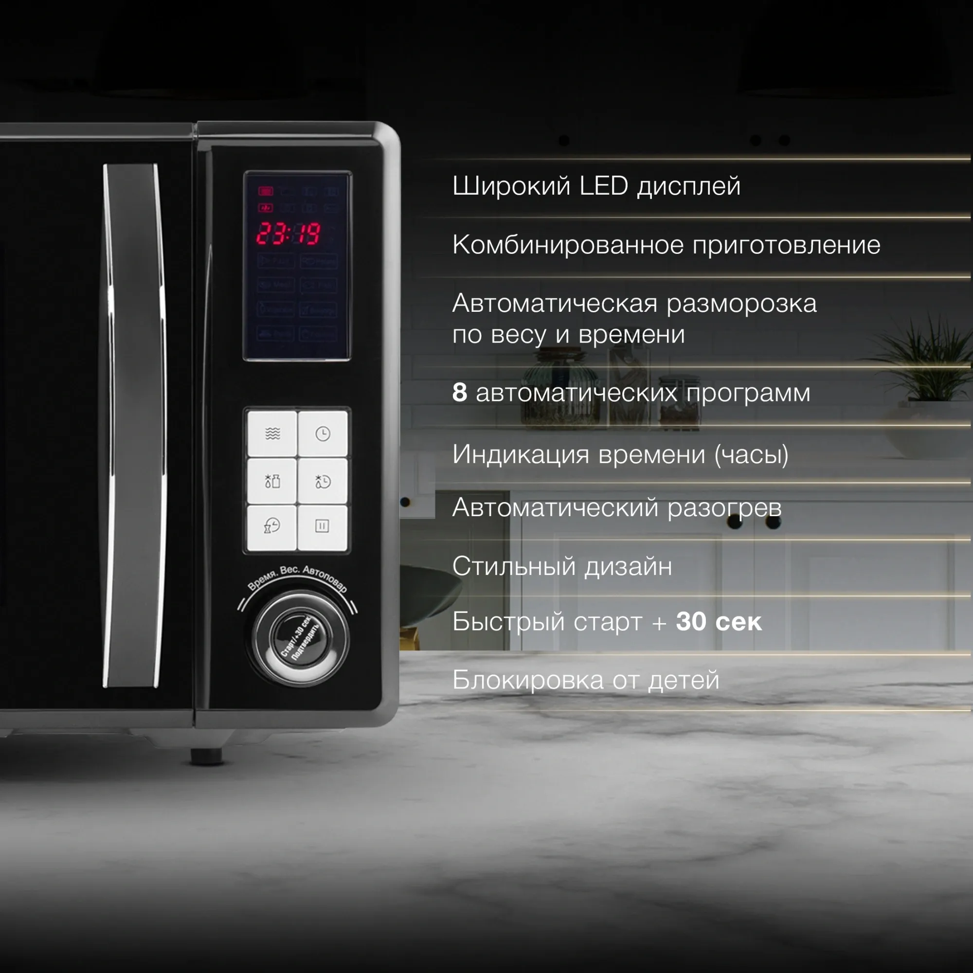 Hyundai HYM-D3009 – универсальная и практичная микроволновая печь из нержавеющей стали. Устройство выделяется не только эффектным, ультрасовременным дизайном, но и повышенной долговечностью. Благодаря солидному объему внутренней камеры в 23 л в микроволновке можно разогревать еду сразу на несколько человек. Широкий поворотный столик диаметром 27 см обеспечивает равномерный прогрев даже больших порций. Мощность печи составляет 800 Вт. Это позволяет всего за 1-2 минуты подогреть готовые блюда. Модель также поможет быстро разморозить продукты и приготовить несложные блюда типа омлета, картофеля в мундире или шоколадного кекса в чашке. Микроволновая печь Hyundai HYM-D3009 оснащена удобным и интуитивно понятным электронным управлением. С помощью шести кнопок можно настроить параметры мощности, задать нужное время, запустить таймер. Удобный поворотный переключатель поможет выбрать нужные автоматические программы с заранее установленными временем и температурой. Они помогут моментально запустить приготовление пиццы, попкорна, овощей, рыбы и других продуктов. На широком цифровом дисплее отображается не только время приготовления, но и подробная информация о приготовлении блюда. Дверца микроволновки открывается за ручку, что делает устройство надежным и простым в эксплуатации.
