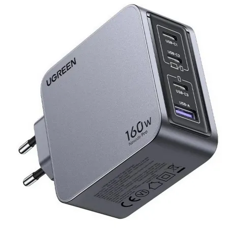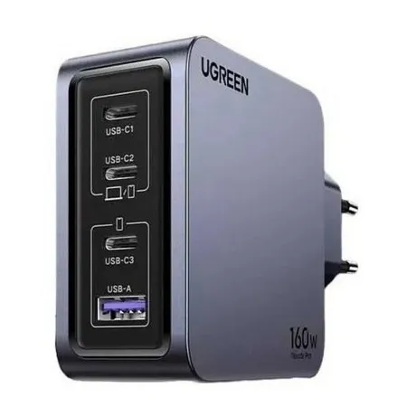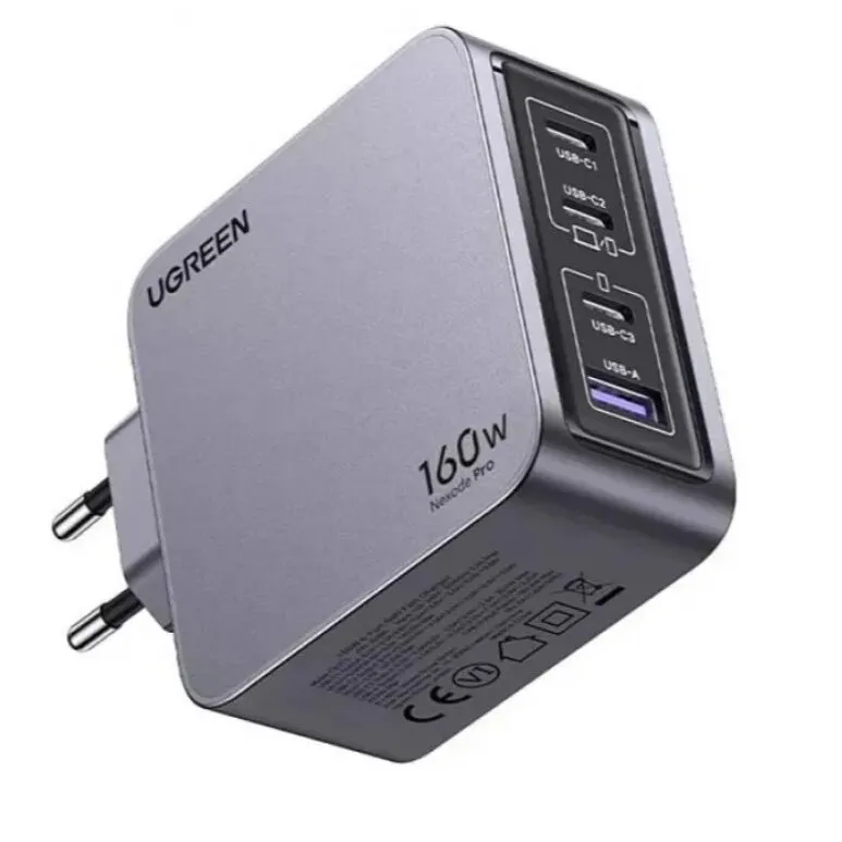 Сетевое зарядное устройство Ugreen X763 с выходной мощностью 160 Вт предусматривает одновременную подачу энергии на несколько устройств. Для подключения кабелей на корпусе расположены 3 разъема USB Type-C и 1 USB Type-A.
